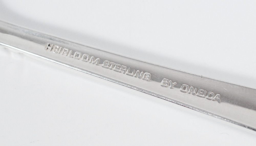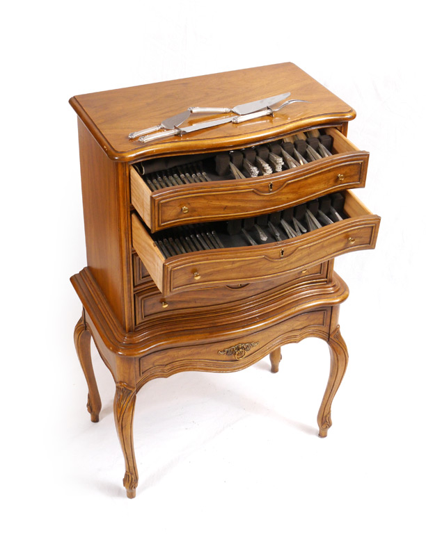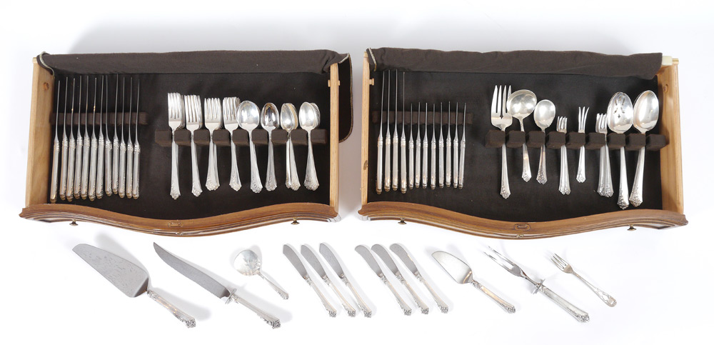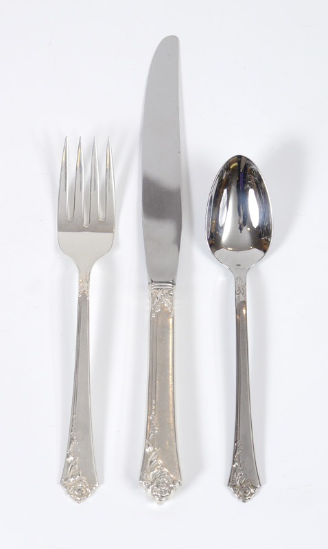 ONEIDA HEIRLOOM DAMASK ROSE STERLING FLATWARE SERVICE: Approx. 134 pieces in the Damask Rose pattern to include 7 forks (7 5/8''), 9 forks (7 1/4''), 16 salad forks (6 1/2''), 31 teaspoons(6 1/8''), 12 soup spoons (6 1/2''), 16 hollow knives (9 1/8''), 3 hollow master butter knives (6 3/8''), 10 hollow butter knives (6 1/4''), 5 serving spoons (8 1/4''), 2 pierced serving spoons (8 1/4''), serving fork (8 1/8''), 9 cocktail forks (5 3/4''), 3 cocktail forks (5 1/2''), 2 lemon forks (5 1/2''), cream ladle (6 1/2''), 2 sugar scoops (6 1/8''), pierced bon-bon server (4 3/4''), hollow cake server (10 1/4''), hollow pie server (7 1/4''), carving set (fork 8 3/4'', knife 11 1/4''). Sold with a 5 drawer French style silver chest on legs, Approx. 129.3 troy oz.