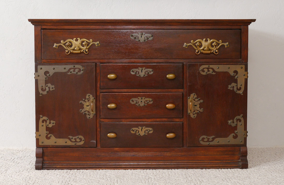 EARLY 20TH CENTURY TRANSITIONAL SIDEBOARD: Mahogany sideboard with full length drawer over 3 central drawers, surmounted by 2 doors with single interior shelves. Mixed metal hardware and pulls. Overall measures 36 3/4'' h. x 54'' x 21 1/2''.