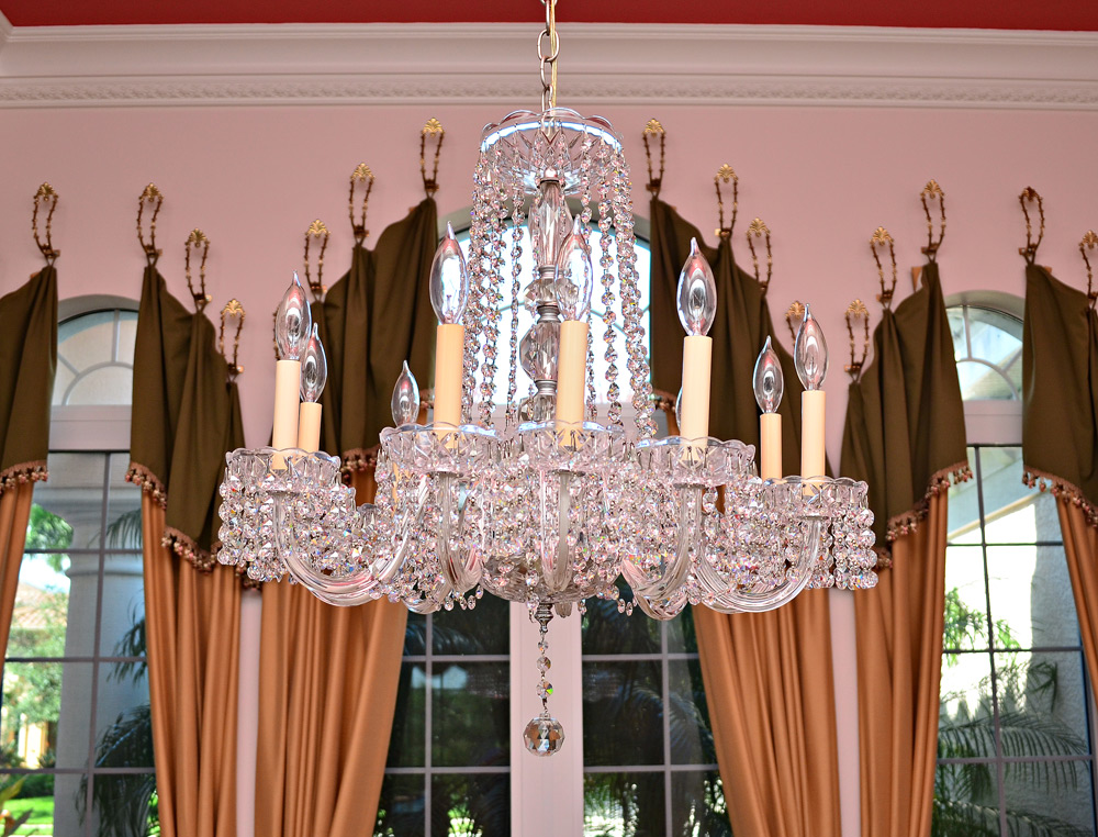 SPARKLING SWAROVSKI STYLE CRYSTAL CHANDELIER: Ten light chandelier literally dripping in pendant swags of faceted prisms. A most rare design incorporating 20 drops per Bobeche! Measures approx. 24 3/4'' h. x 23 3/4'' dia.
