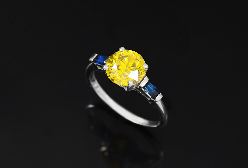 PLATINUM 2.3 CT YELLOW DIAMOND SOLITAIRE RING: Fancy intense yellow round brilliant diamond, approx. 2.30 Ct, measures 5.27 mm. Clarity is VS1. There are two baguette cut sapphires at the sides, each approx. .25 Ct. Size 7.5. Weight 4 grams. Sold with current Florida Diamond Appraisers GIA graduates appraisal for $16,350.