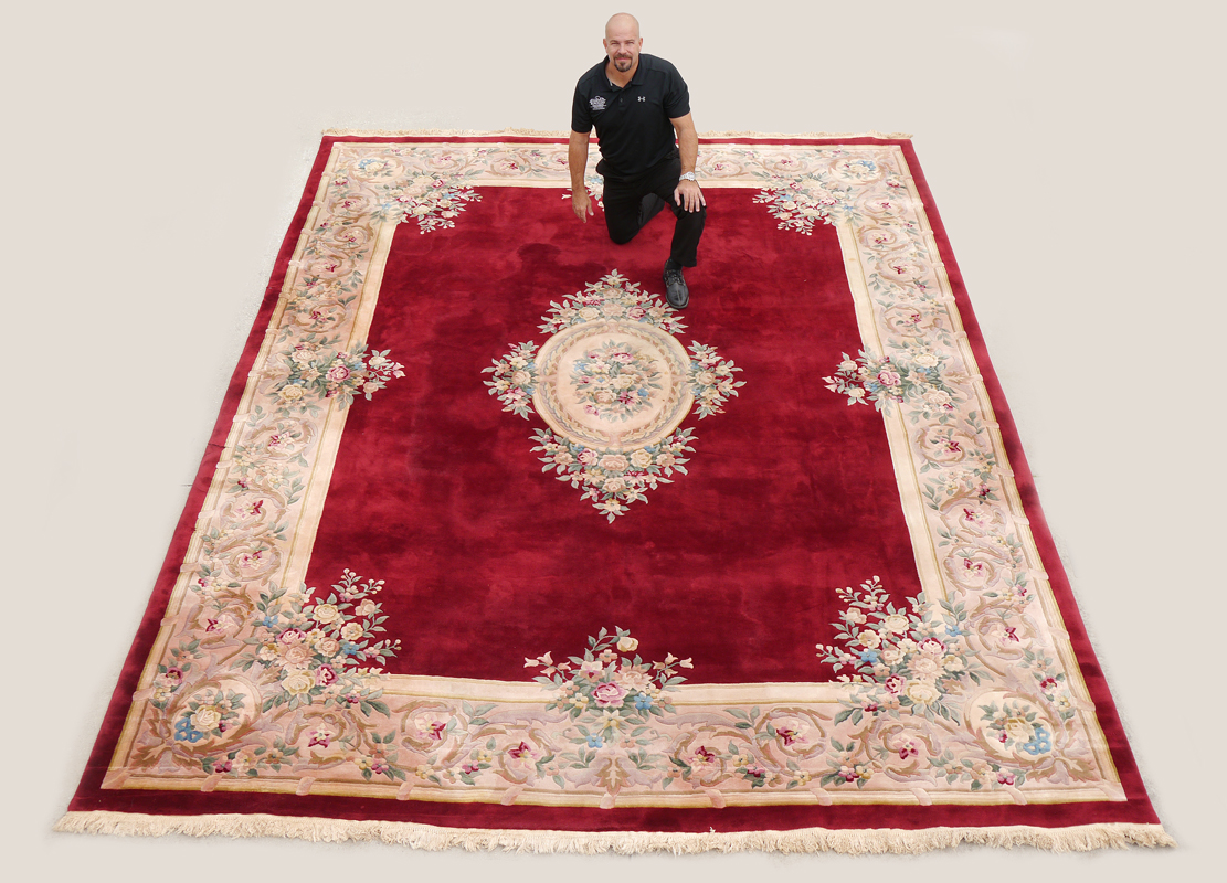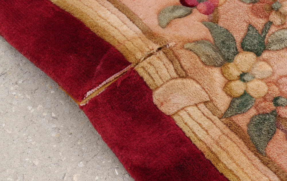 CONDITION: There are some slight stains and there are two slits found on one side that need to be repaired again. They don't detract too much from the look of the rug and will be undetectable when they are professionally repaired.