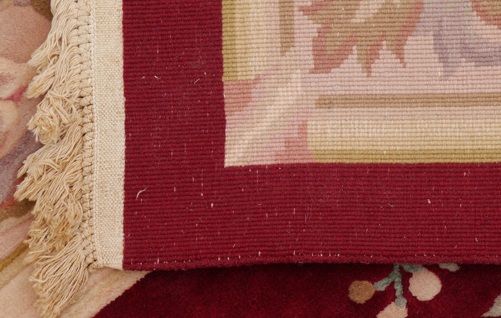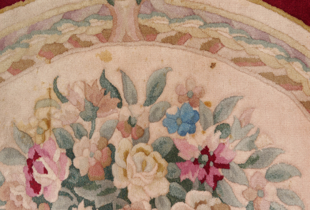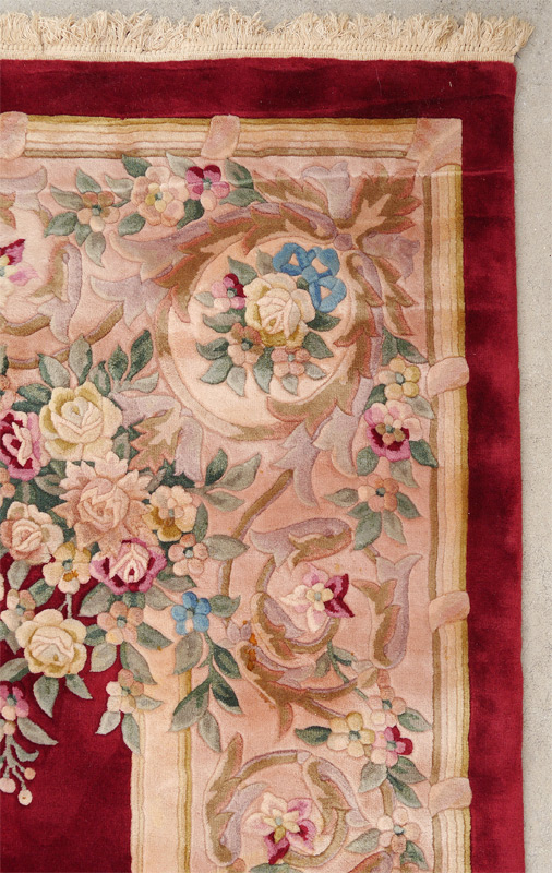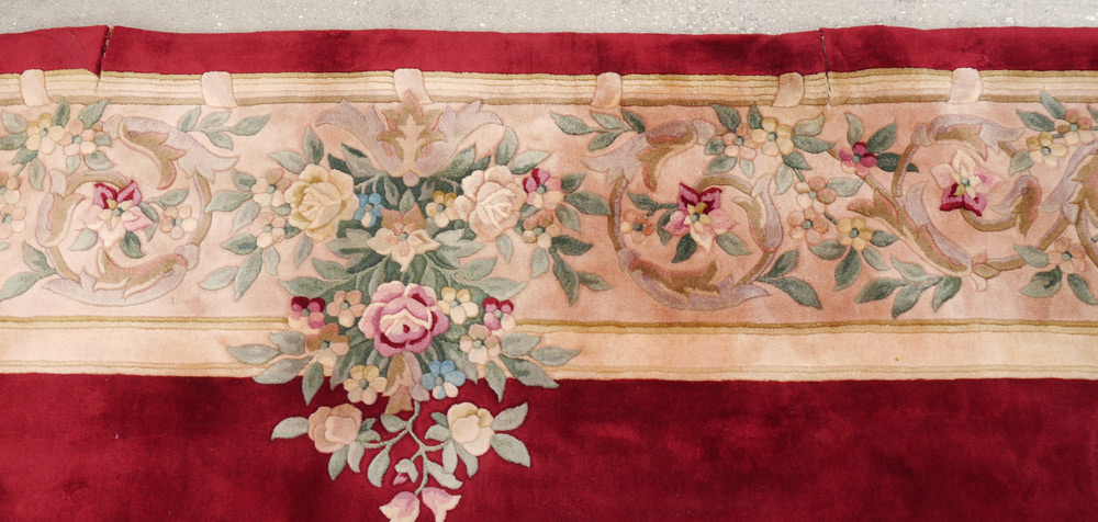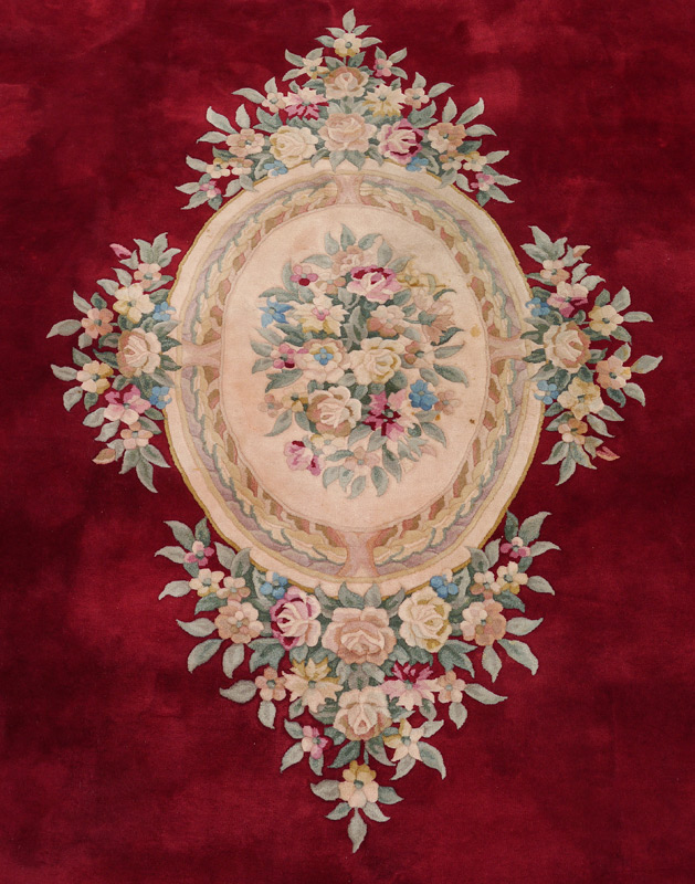 SEMI-ANTIQUE CHINESE NICHOLS PALATIAL ROOM SIZE CARPET, 11'10'' x 14'10'': This hand knotted wool rug has a rich colored burgundy open field with a large central medallion done in pastel colors that are also found in the border and the sprays of flowers that come into the field from the border. The contrast of colors gives the rug a dramatic look.