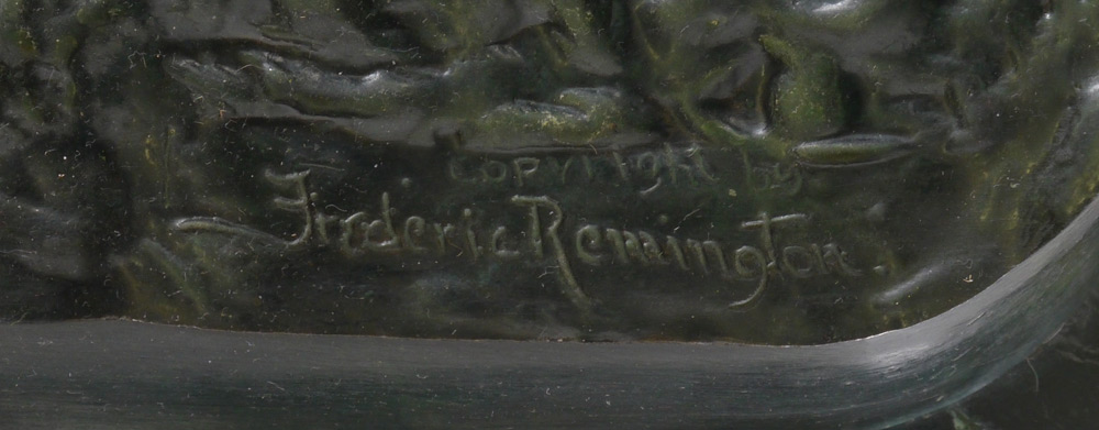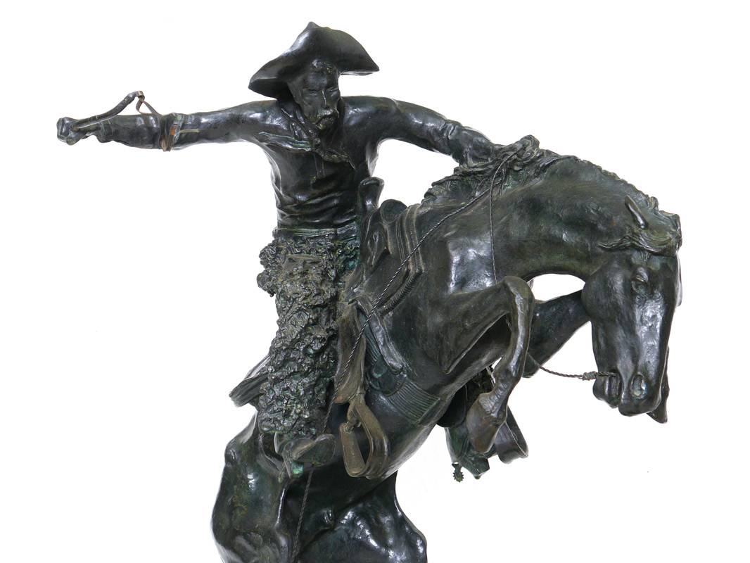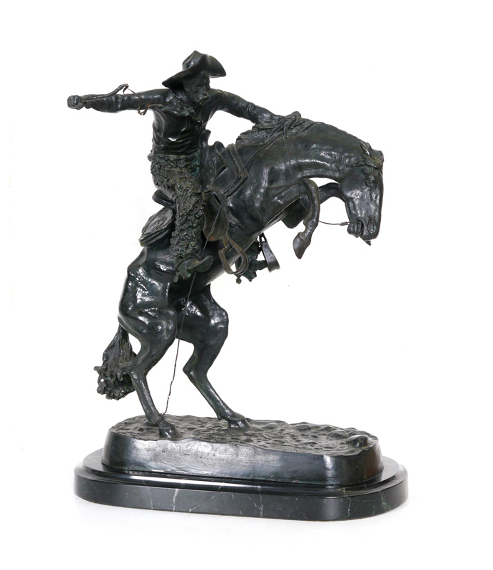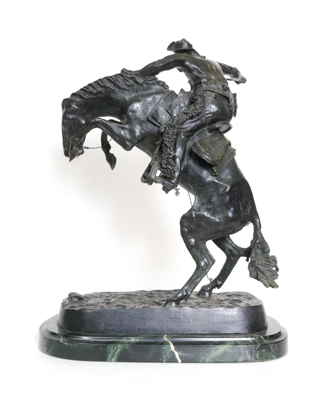 BRONZE BRONCO BUSTER SCULPTURE AFTER REMINGTON: 21 1/2'' h. x 15'' w x 7'' d., affixed to a beveled marble plinth, overall 23'' h. x 16'' w. x 9 1/2'' d., incised signature to base, exceptional casting with age and patina.
