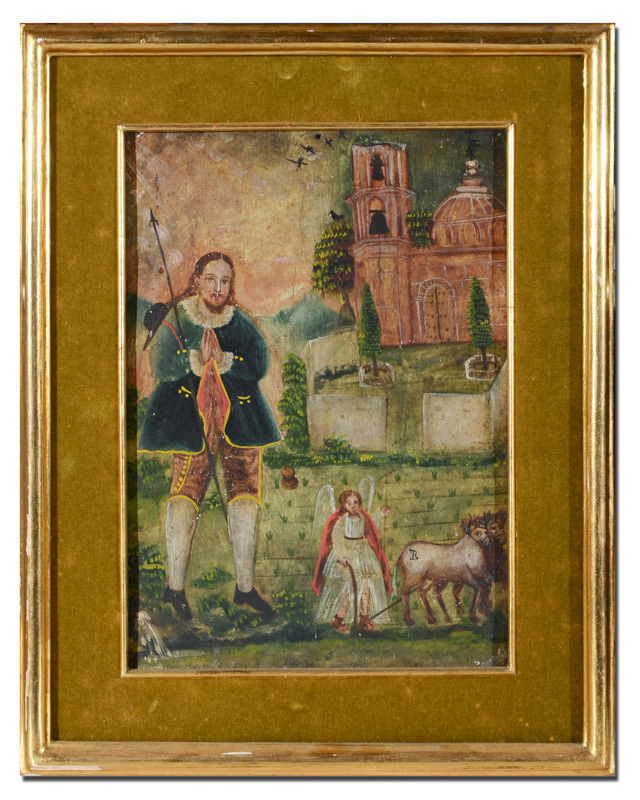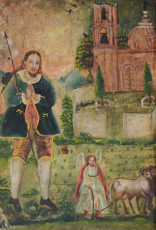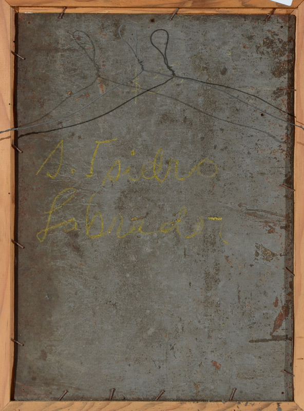RELIGIOUS SCENE, OIL/TIN, ''S. ISIDRO LABRADOR'' VERSO: 14'' X 10'', newer frame, 18 5/8'' x 14 3/4''.