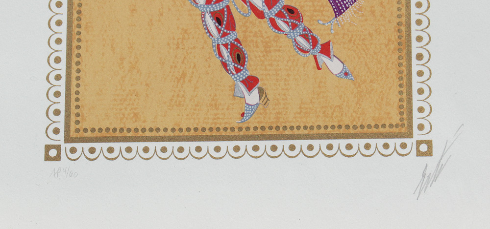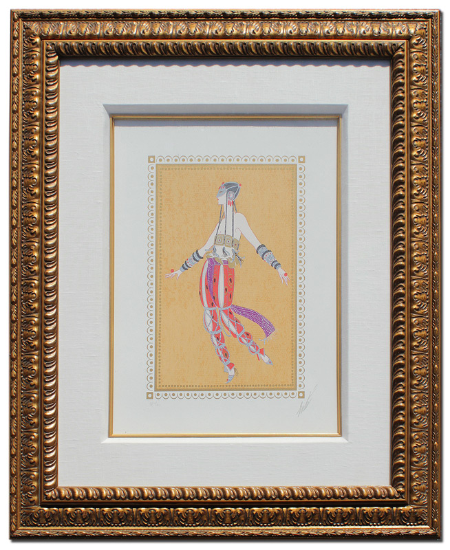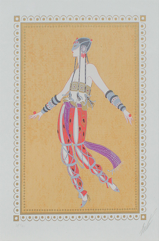 ERTE SIGNED LITHOGRAPH ''SCHEHERAZADE #9'': Sight size 17 1/2'' x 12 3/4'', pencil signed lower right, marked AP for Artist Proof lower left, #'d 4/60, encased in a carved and gilded wood frame 30'' x 25 1/4''.