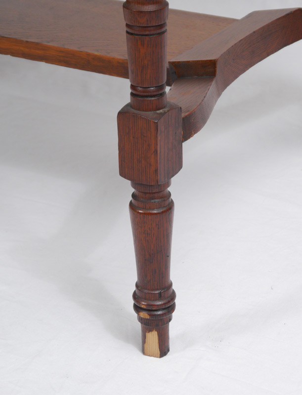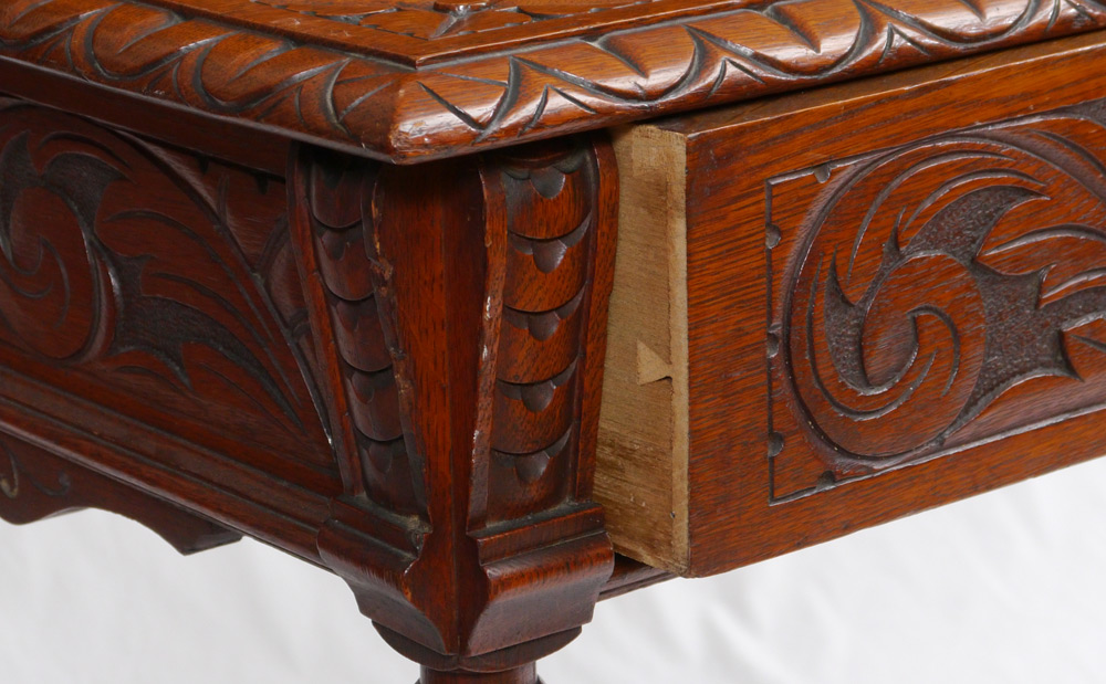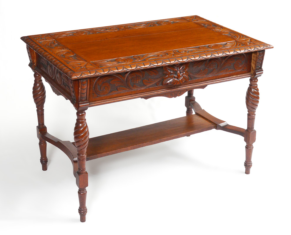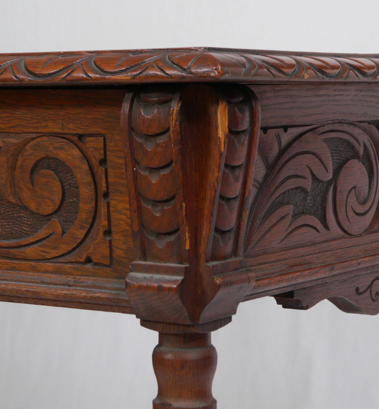 NORTHWIND CARVED OAK LIBRARY TABLE: Top framed with carved foliate scroll, edge with repeating pattern. Single drawer with carved Northwind masqueron pull, open lower stretcher / shelf, turned legs. Overall 30 1/2'' h. x 42 1/2'' x 26''.