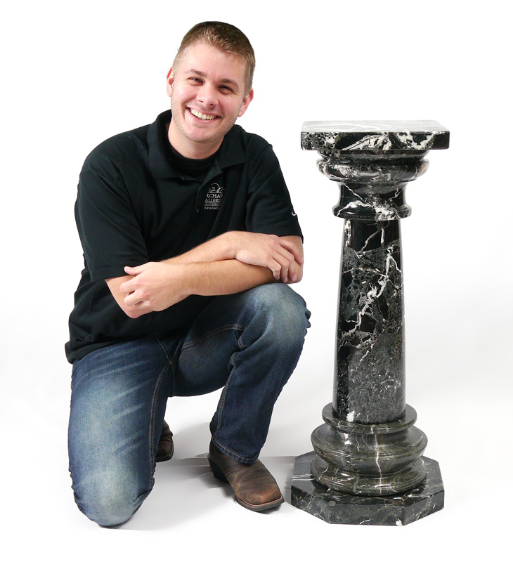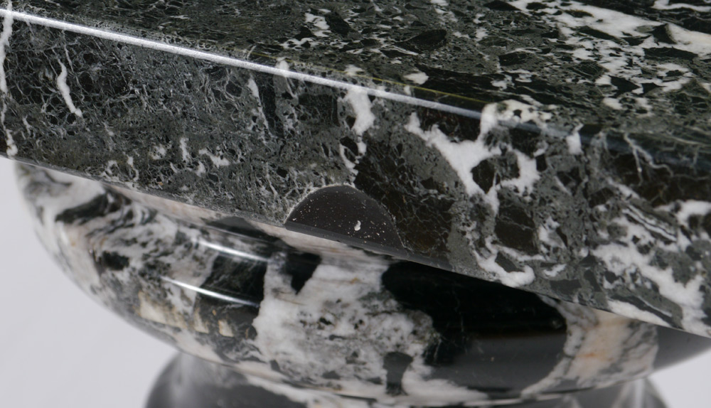 BLACK VARIEGATED MARBLE PEDESTAL: Square top, polished body, 14'' octagonal base, 34.5''h., top 12.25'' square.