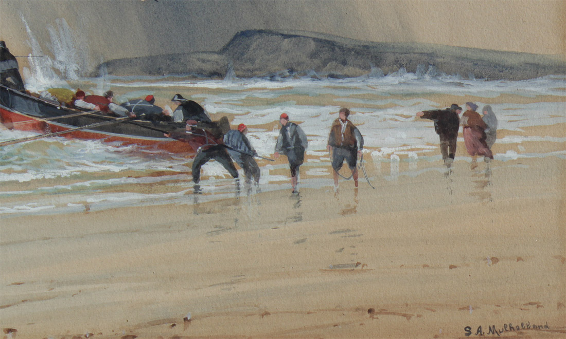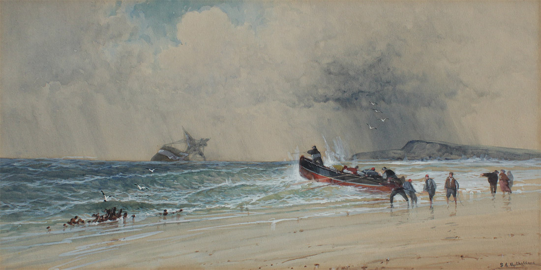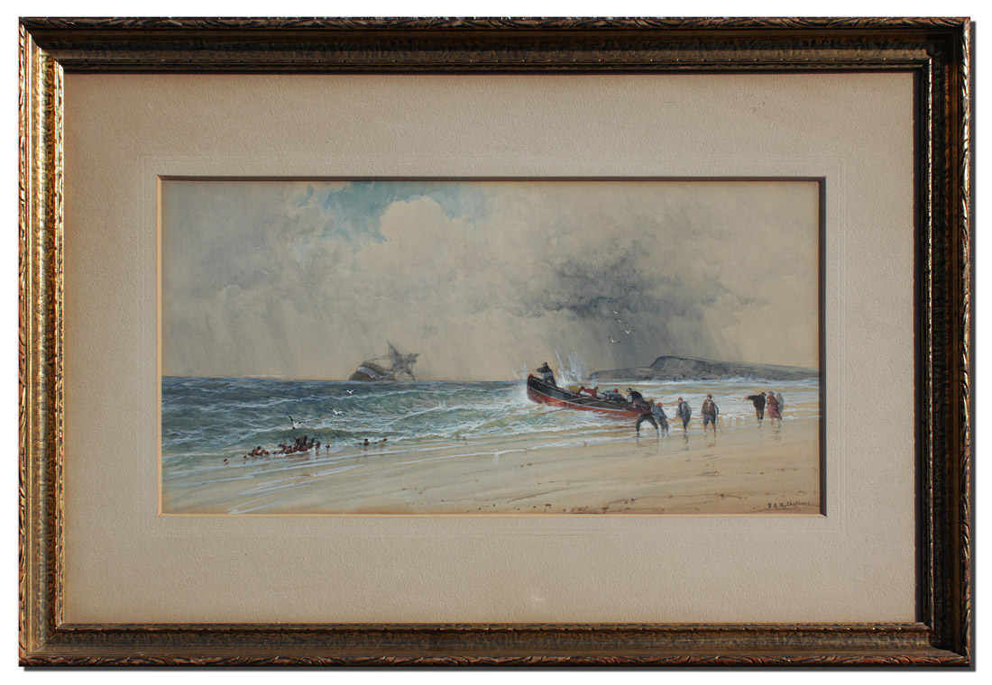 MULHOLLAND, Saint Clair Augustin, (British, 1839-1910): Rescuers Rowing out From a Beach to a Grounded Ship, Watercolor Heightened/White, Sight size 11'' x 23'', signed lower right, encased in a carved gilded frame with wear 21 1/4'' x 32 1/2''.