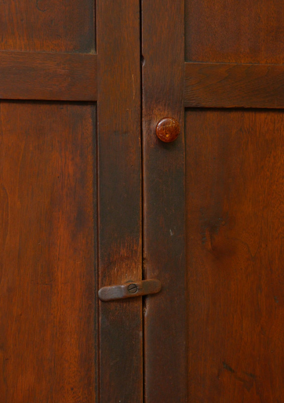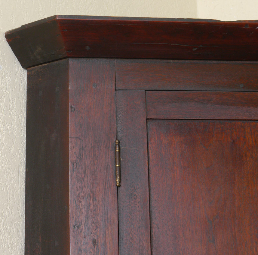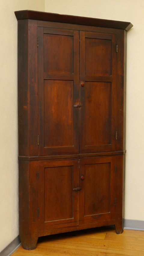 EARLY AMERICAN BLIND FRONT CORNER CABINET: Top with 3 interior shelves, base with single shelf. Overall measures 81'' h. x 46 1/2'' x 20 1/2''.