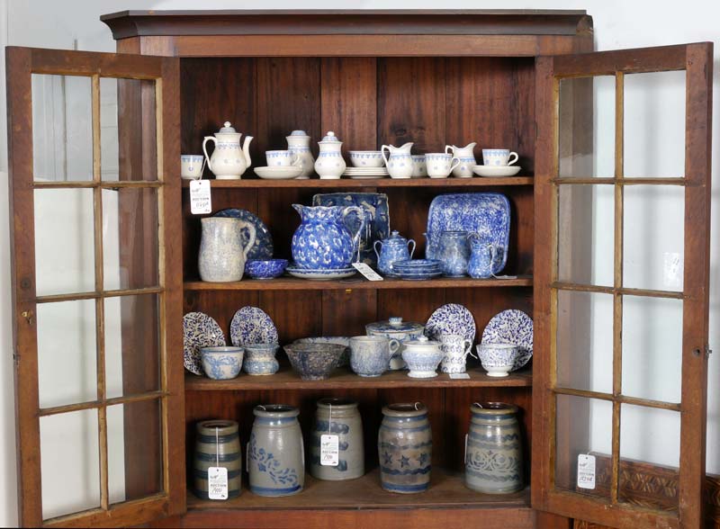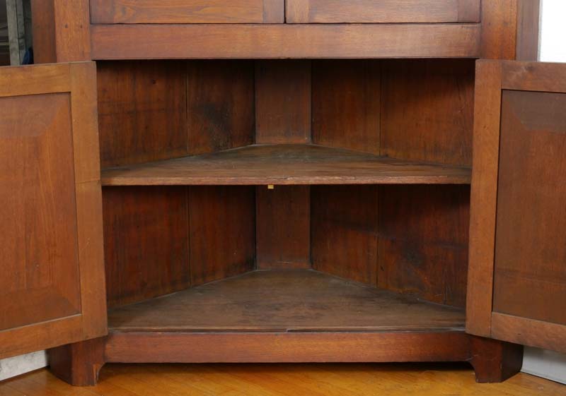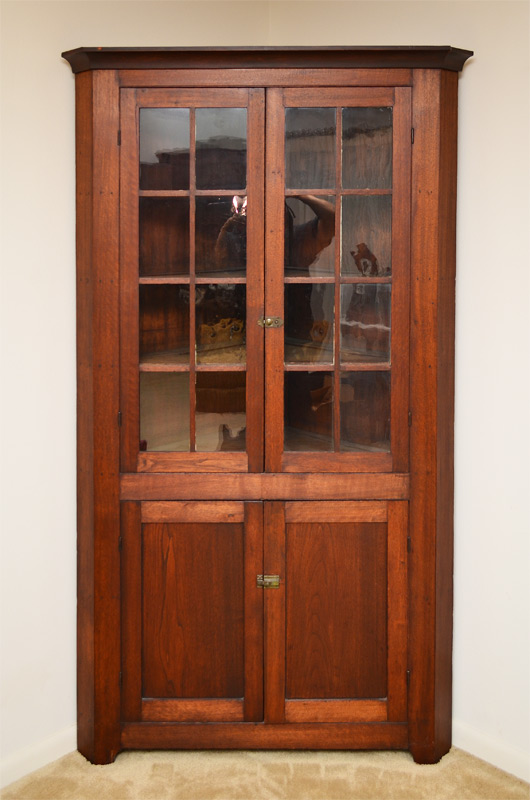 CHERRY 16 LIGHT CORNER CUPBOARD: 16 light double glass door top section with 3 shelves, lower section with single shelf. 77 1/2'' x 44 3/4'' x 21 1/2''.