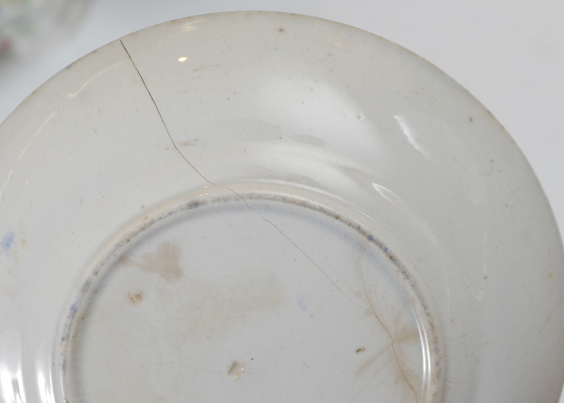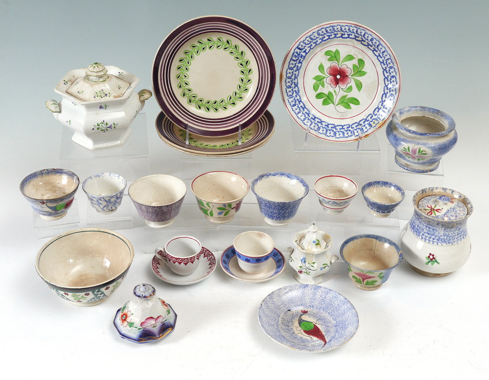 COLLECTION OF STICK SPATTER AND SPONGEWARE: A 23 piece accumulated collection of handleless cups, saucers, Pea Fowl cup and saucer.
