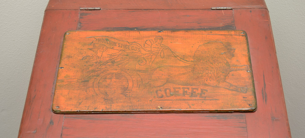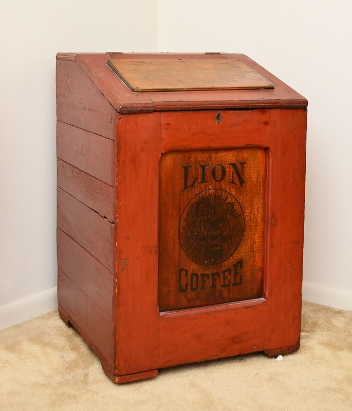 WOOLSON SPICE LION COFFEE ADVERTISING BIN: Red painted bin, slant front top with engraved Woolson Spice Co. wood plaque. Front with engraved Lion Coffee logo. Overall measures 32 1/2'' h. x 21 1/2'' x 22''.
