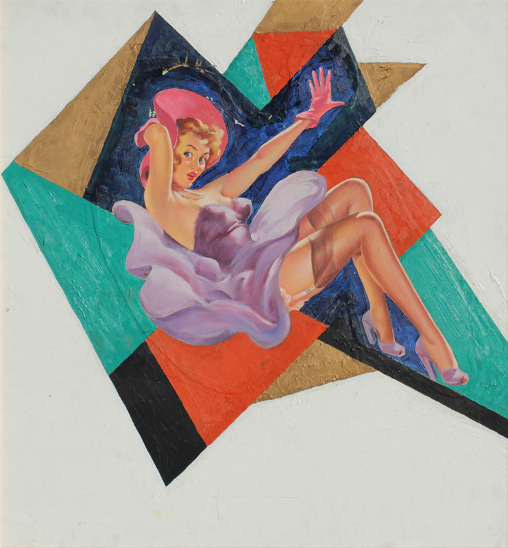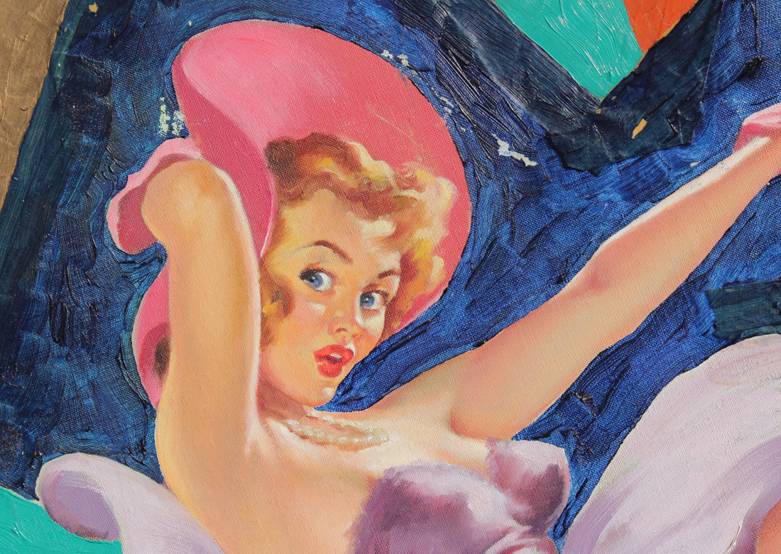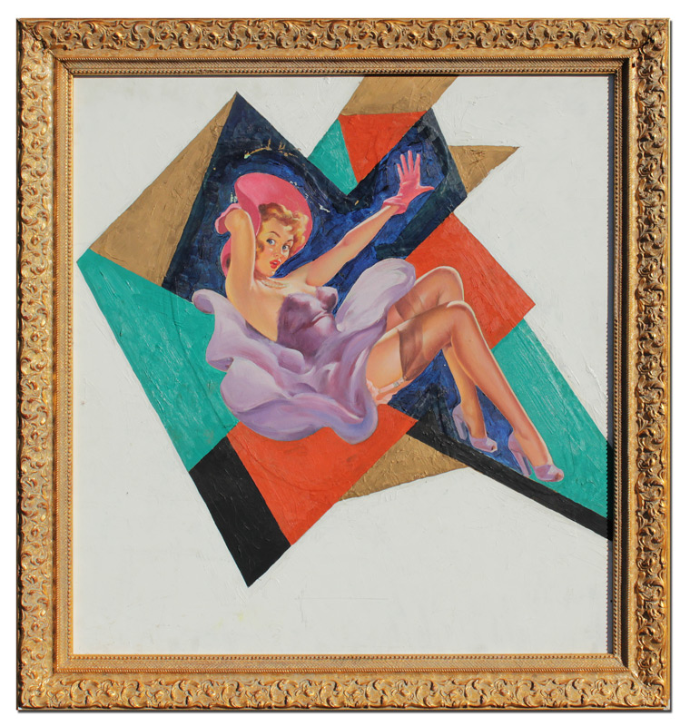 EXCEPTIONAL PIN-UP PAINTING OF A YOUNG GIRL UNSIGNED: Painting with Collage, Oil/Canvas/Masonite, 32 1/4'' x 30'', encased in heavy gilded and carved foliate motif gesso frame with minor wear 38'' x 35 3/4''.
