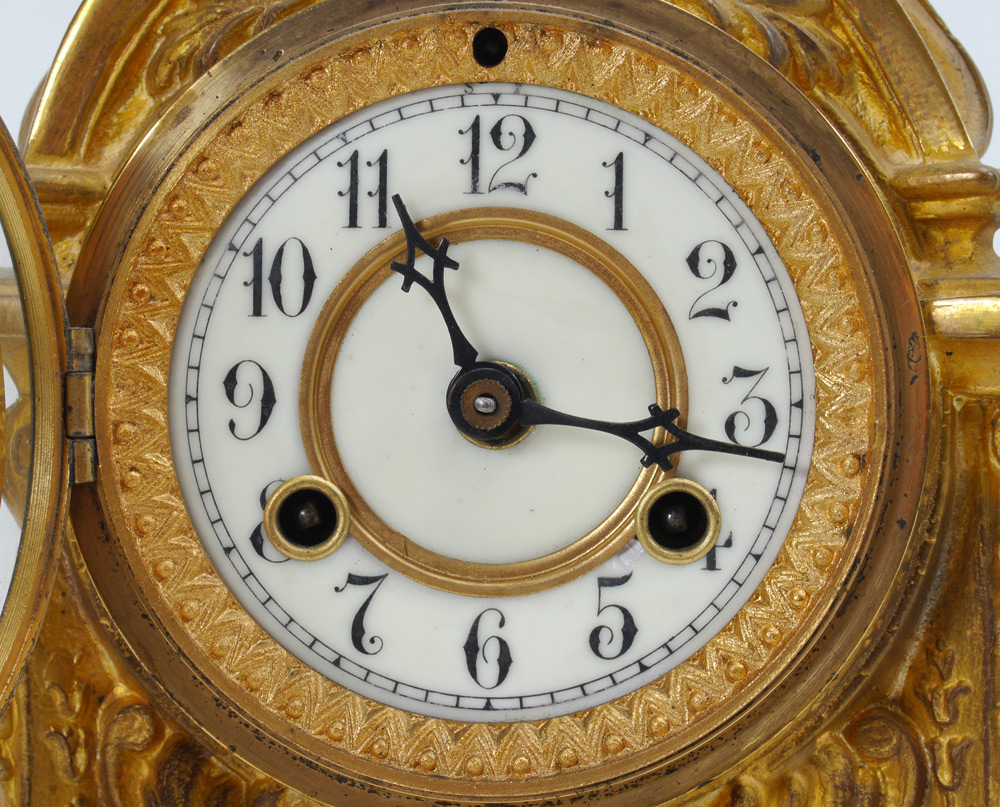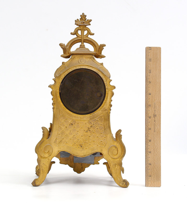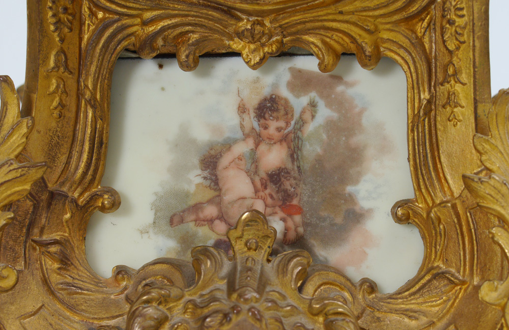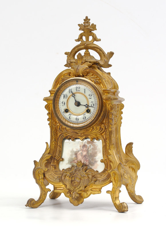 WATERBURY GILT BRONZE AND PORCELAIN MANTLE CLOCK: Rococo revival style gilt bronze case with foliate and masqueron, lower transfer porcelain plaque featuring putti. Waterbury time and strike movement, porcelain dial with Arabic numerals. Measures 15'' h. x 8 1/4'' x 6''