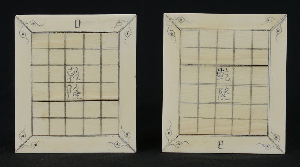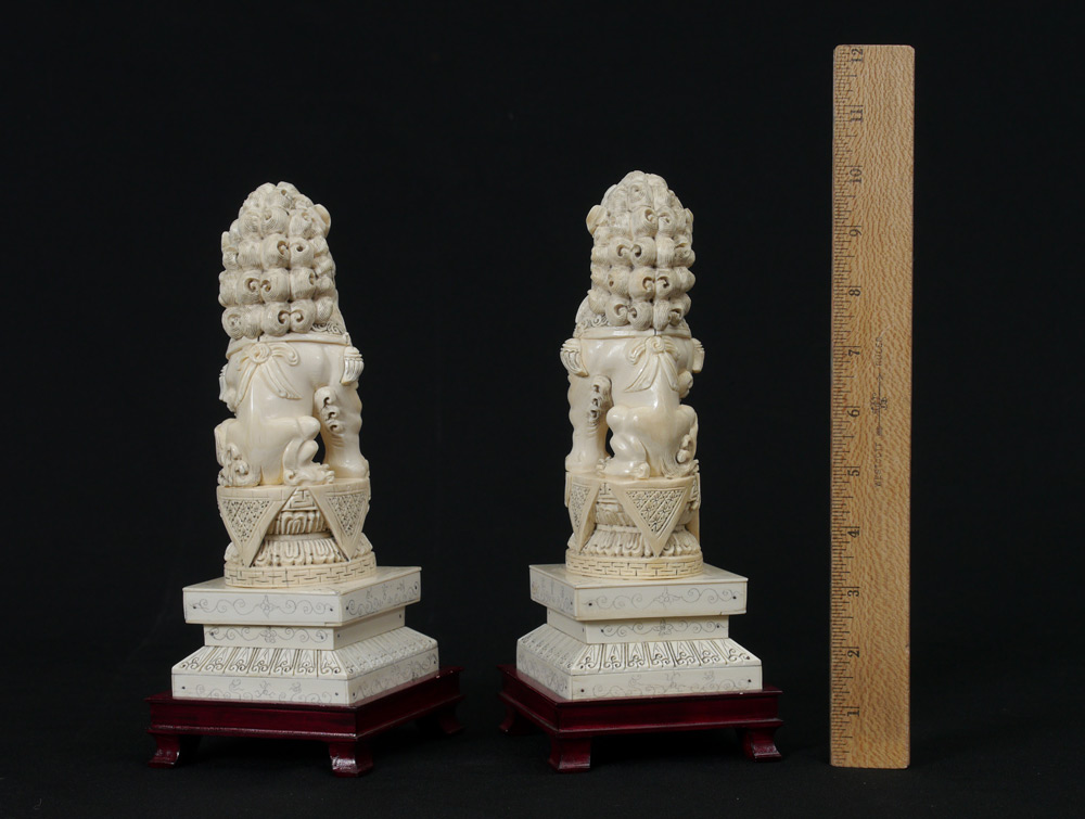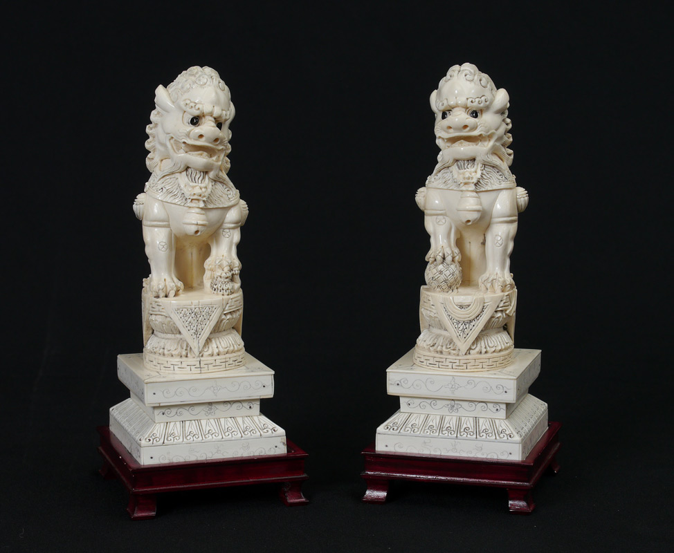 PAIR CARVED IVORY PALACE GUARD FOO LIONS: Each signed on base, measures 9'' h. Sold with carved wood stands 1 1/4'' h. x 4'' x 4 1/2''.