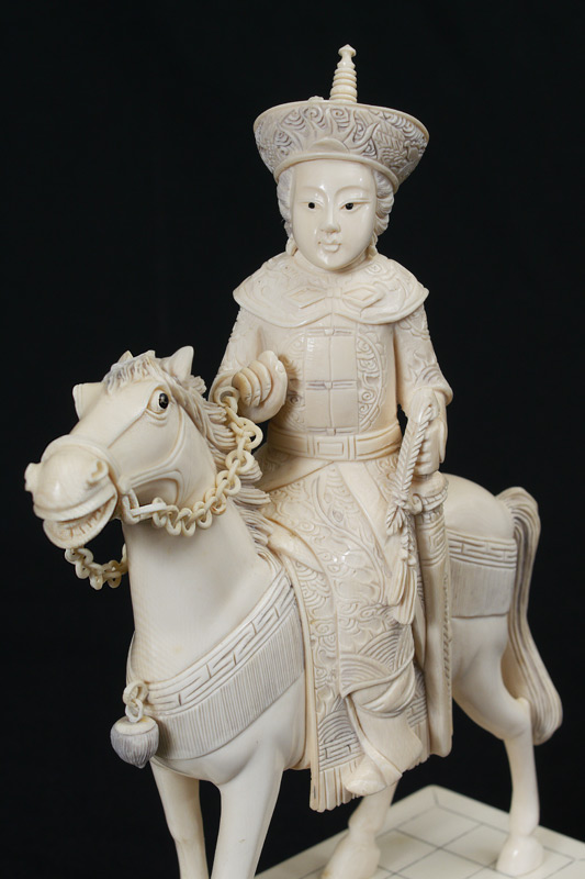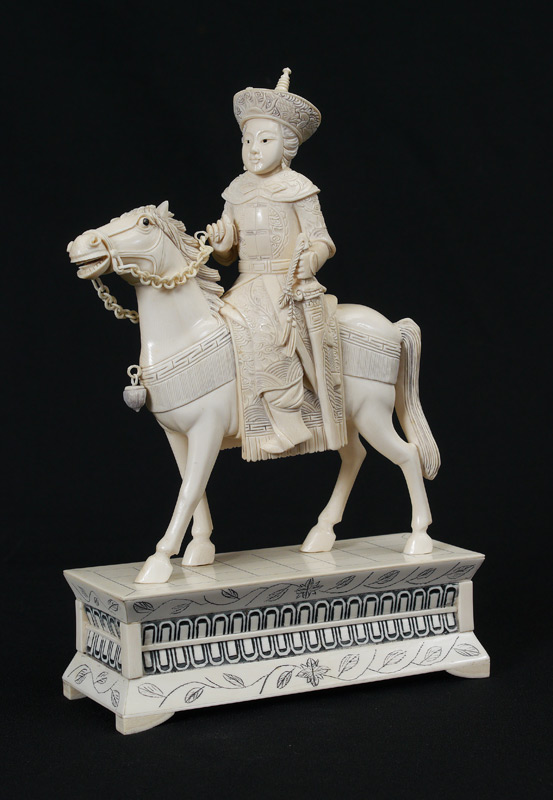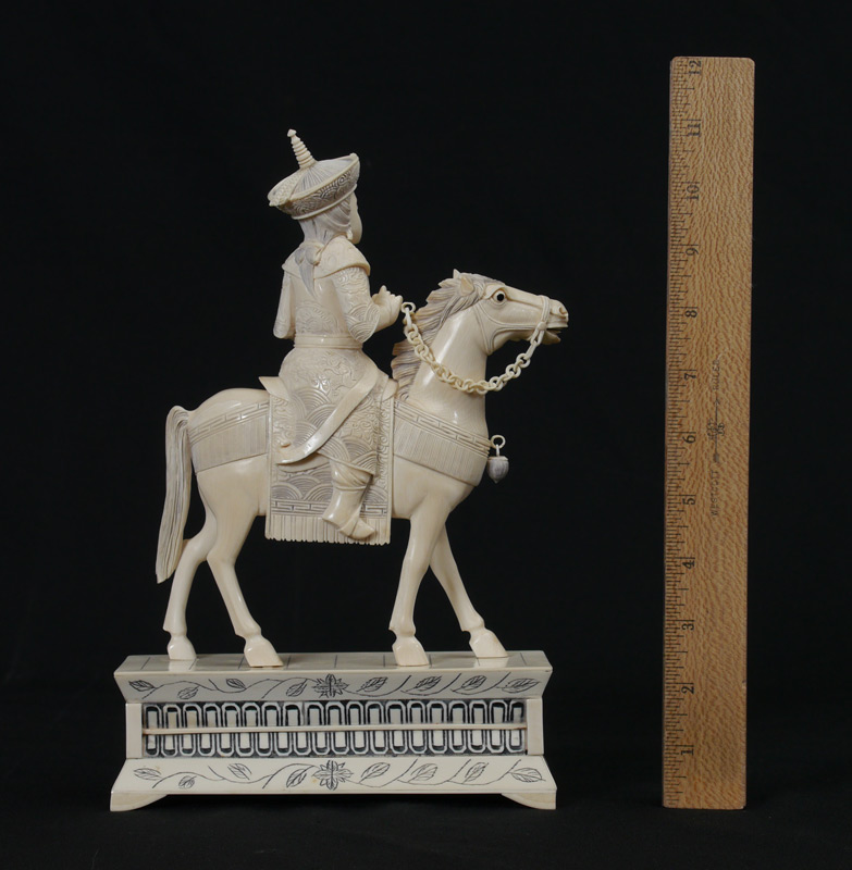 CARVED IVORY ROYAL FIGURE ON HORSEBACK: Figure of a royal figure with sword mounted on horseback affixed to clad ivory base. Unsigned. 11'' h. x 7'' x 3''.