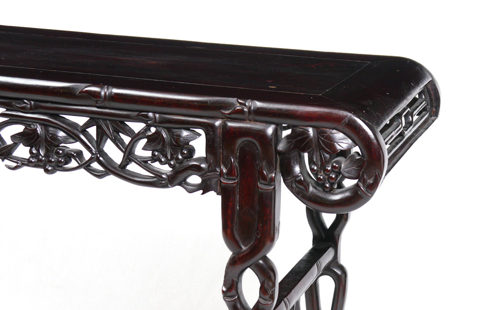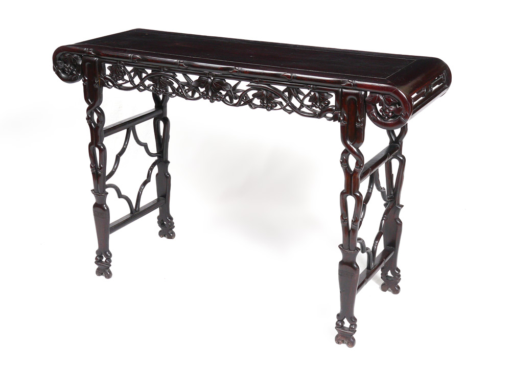 CHINESE CARVED ALTAR TABLE: Top with carved scroll ends, pierced carved skirt and legs with foliate motifs. Measures 33 1/2'' h. x 49 1/2'' x 16 1/2''.
