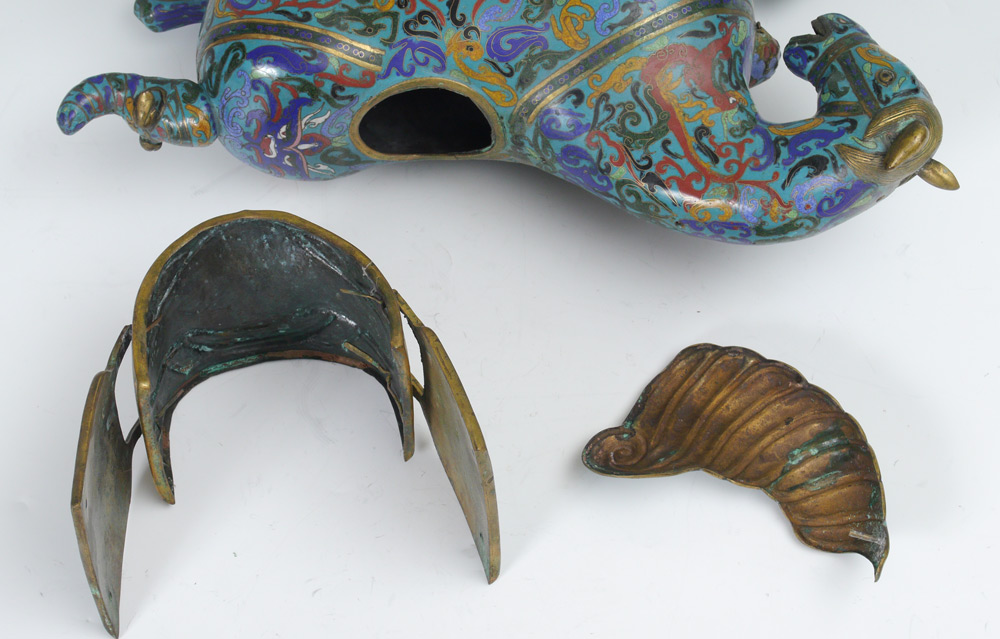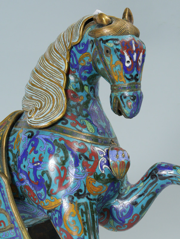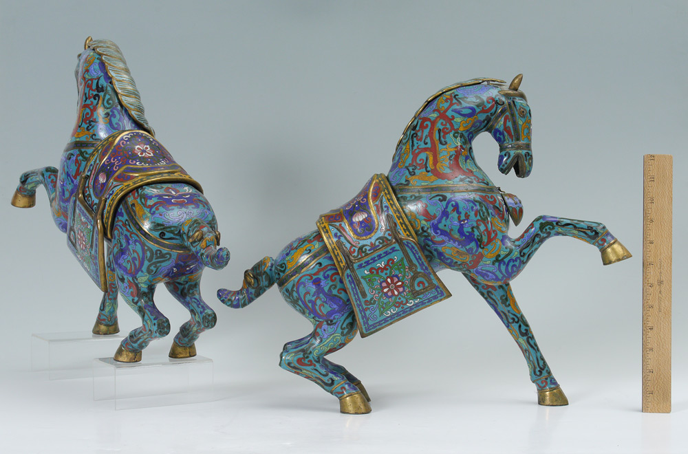 PAIR LARGE CLOISONNE HORSES: Mirror image pair, cloisonne on brass. Measures 16'' h. x 21'' x 6''.