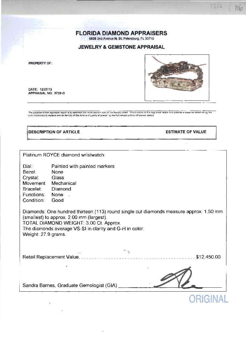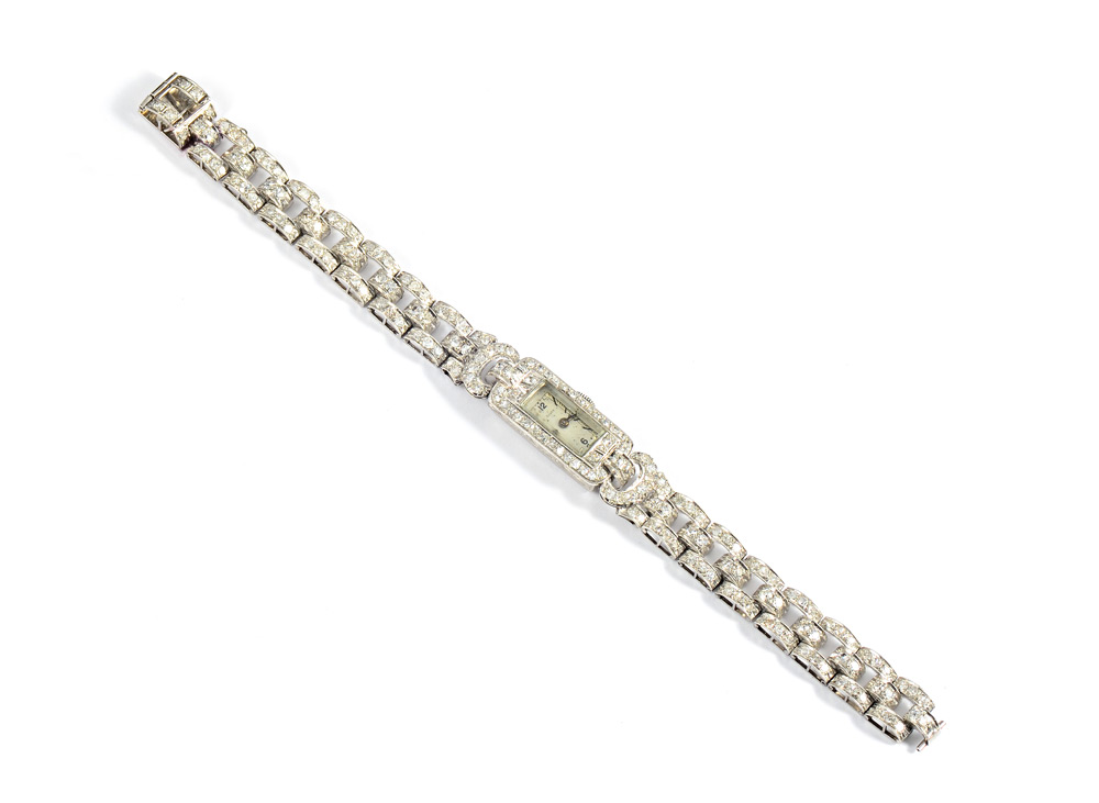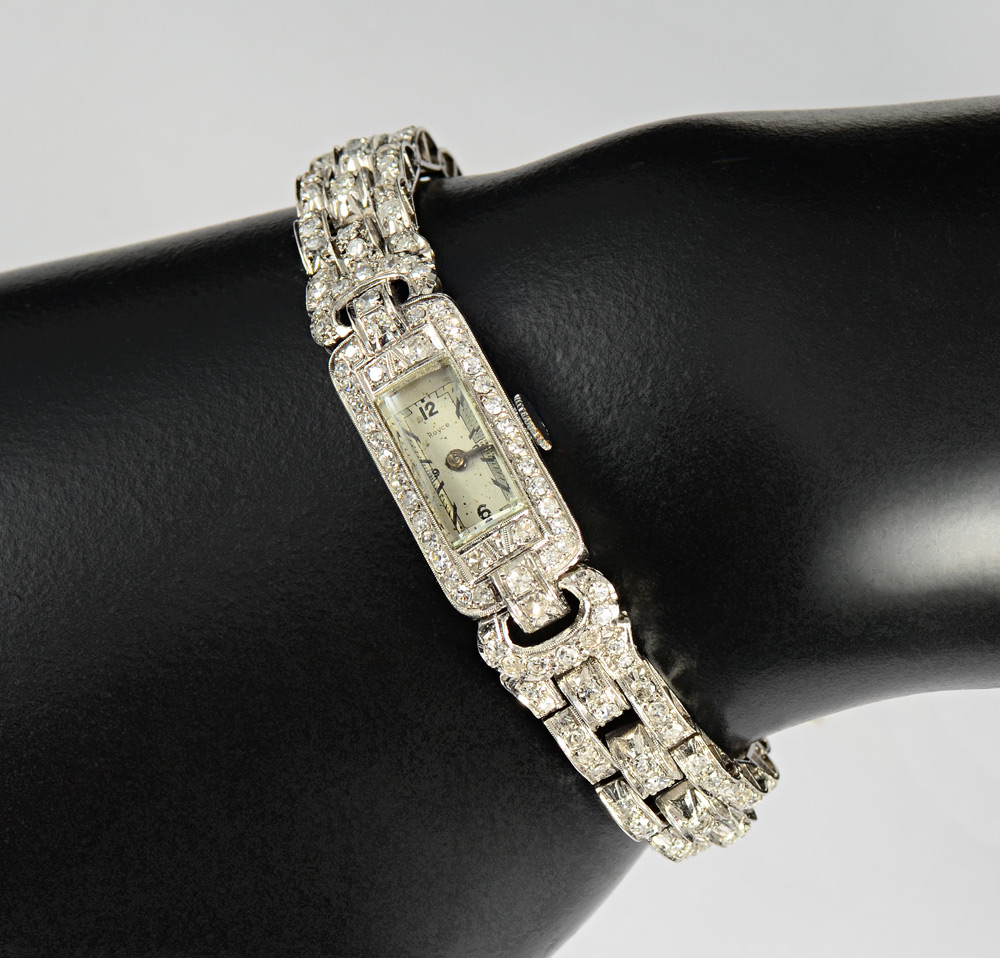 ROYCE PLATINUM & DIAMOND LADIES WATCH: The bracelet and case set with 113 round single diamonds totaling approx, 3 Ct. VS-SI clarity and G-H color. Royce signed rectangular dial with painted markers. Mechanical movement. Length 6.5''. Weight 27.9 grams. Sold with current Florida Diamond Appraisers GIA graduates appraisal for $12,450.