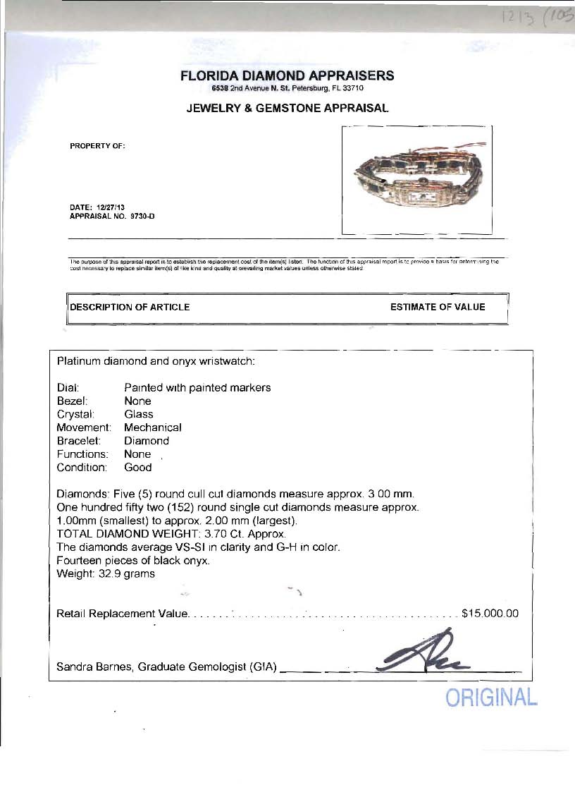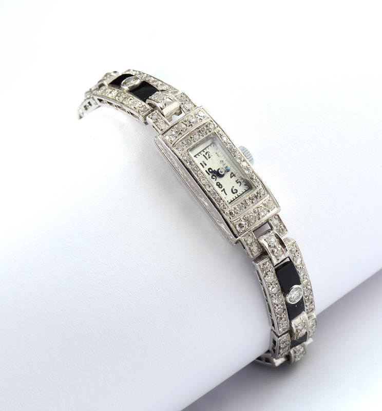 ANTIQUE PLATINUM, DIAMONDS, & ONYX LADIES DRESS WATCH: The bracelet and case with diamonds totaling approx. 3.70 Ct., averaging VS-SI clarity and G-H color. Each link holds a black onyx tablet. Length 6''. Weight 32.9 grams. Sold with current Florida Diamond Appraisers GIA graduates appraisal for $15,000.