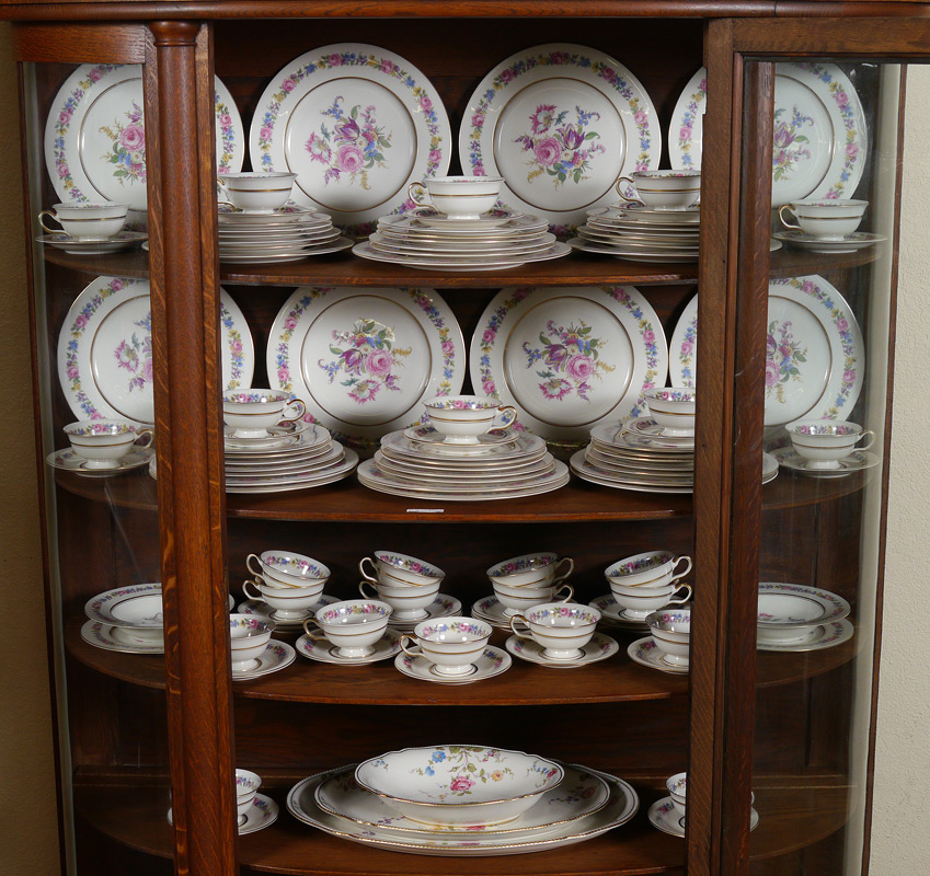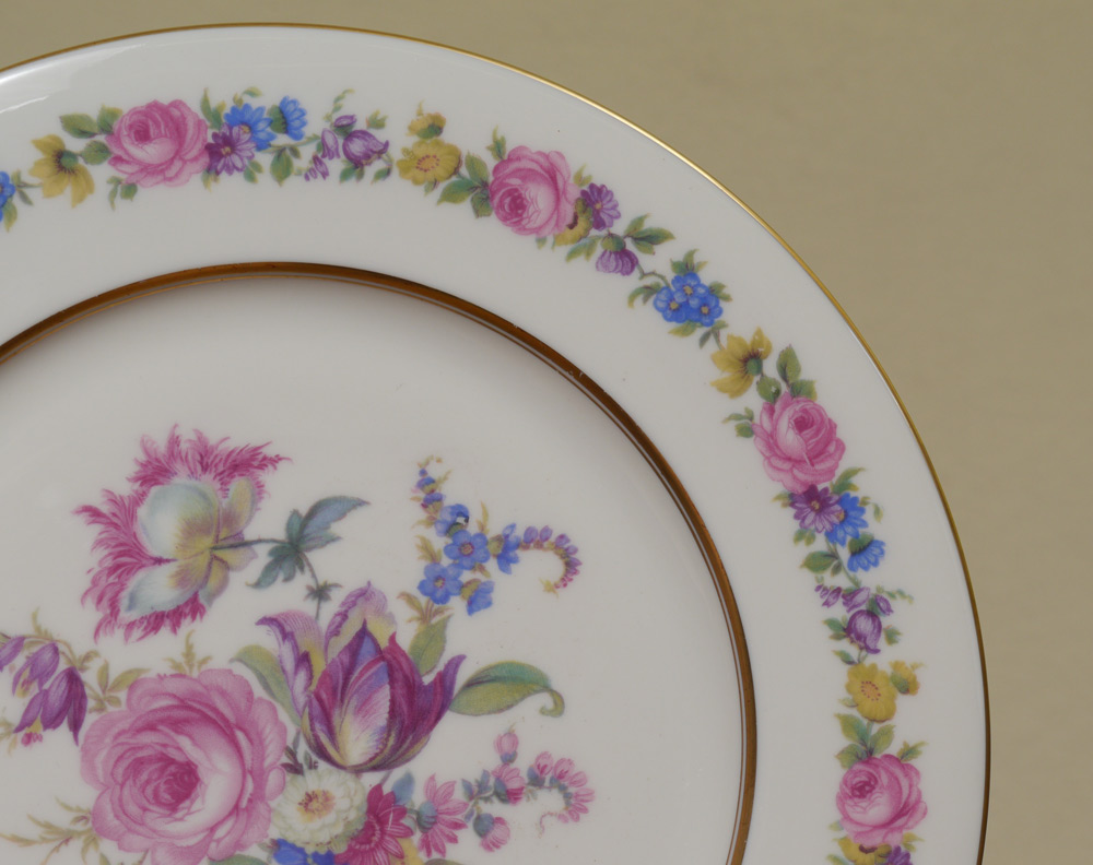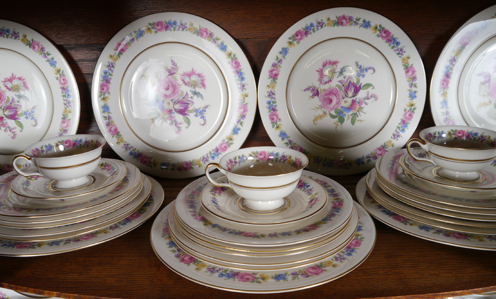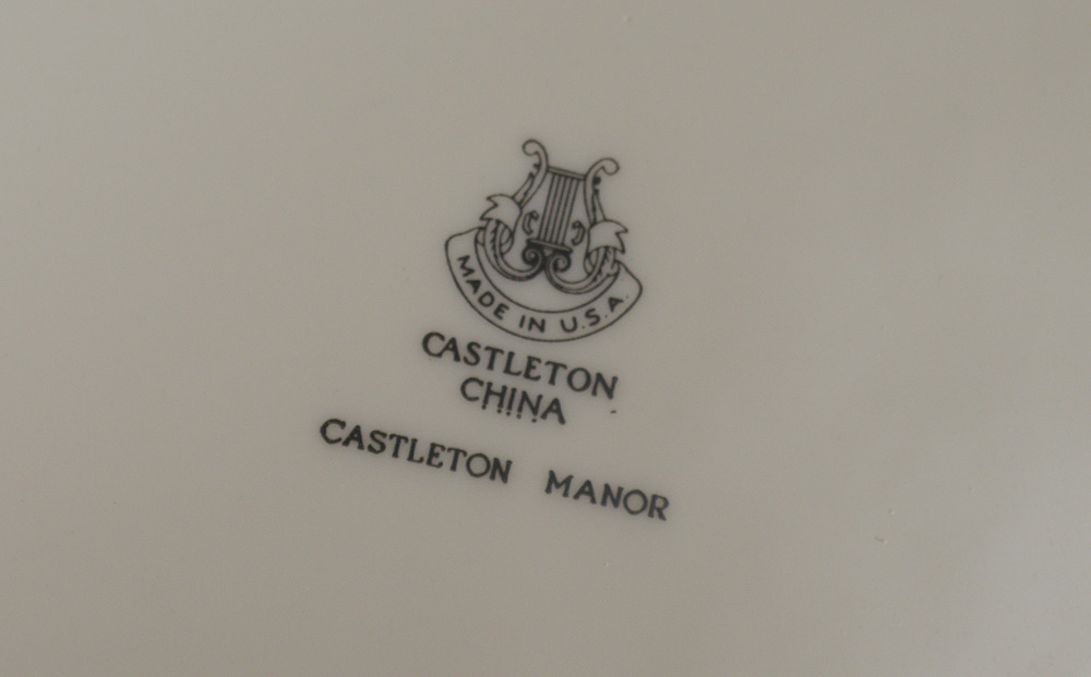 CASTLETON FINE CHINA IN THE MANOR & SUNNYVASE PATTERNS: Approx. 102 pieces ''Manor'' to include 17 dinner plates (10 5/8''), 12 luncheon plates, 20 salad plates, 2 soup bowls, 25 cups and 25 saucers: The three serving pieces are ''Sunnyvale'', 2 platters ( 18'' and 15''), and the open vegetable bowl.