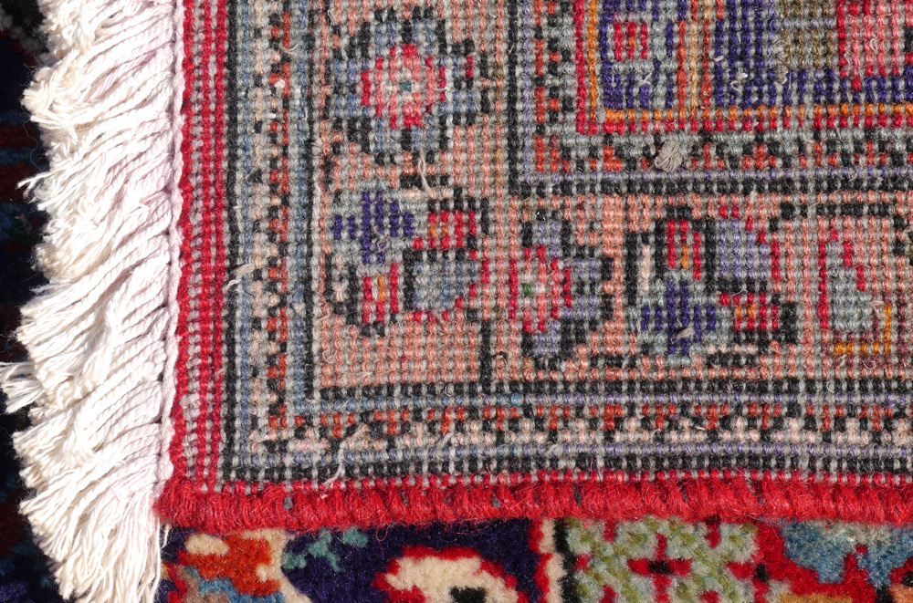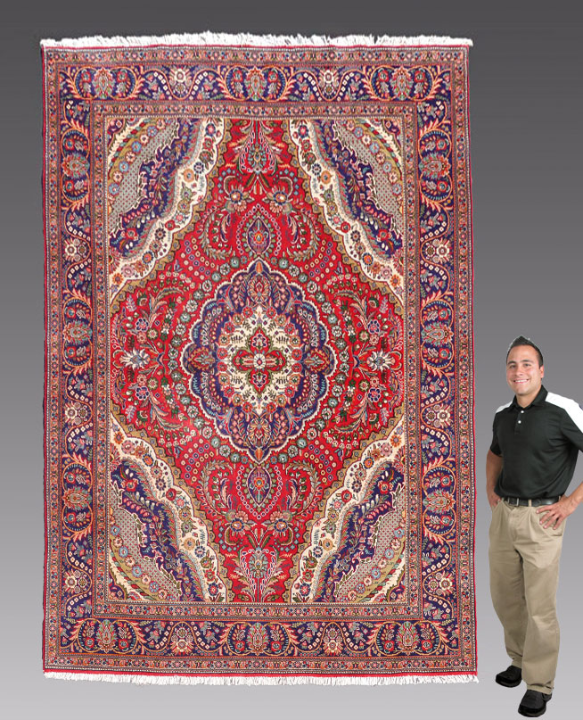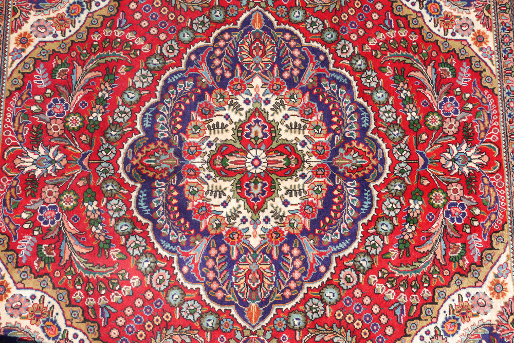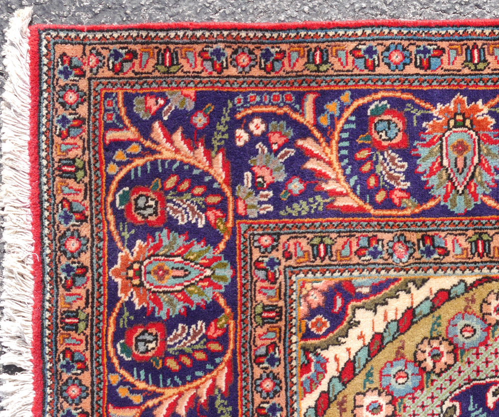 APPROX 35-45 YR OLD PERSIAN HAND KNOTTED WOOL RUG, 8'4'' x 11'5'': This rug has an overall design that has been used in the Tabriz area but it isn't the very fine knotting that is found on most rugs from that area. However, the design is very well executed to make this a lively and interesting rug that would add to the beauty of any home. There is a blue ground central medallion with a red and white center and accents of greens, pink, beige, and peach that lies on a red field. Sprays of flowers and leaves radiate out from the medallion done in the same colors. The corners of the field are composed of bands of patterns; flower-heads, X's, barber pole stripes; on backgrounds of white, blue, yellow, etc. that add to the charm of this rug. Condition is good.