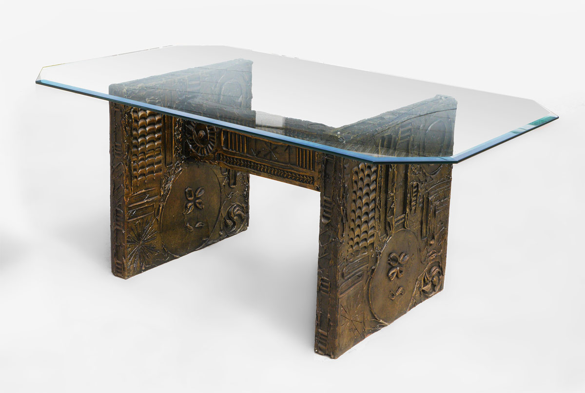 ADRIAN PEARSALL DINING OR CONFERENCE TABLE: Ca. 1970's. The bronzed composite base measures 28 3/4'' h. x 41 3/4'' x 29 1/4'', the beveled glass top 72'' x 42''.