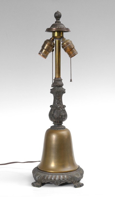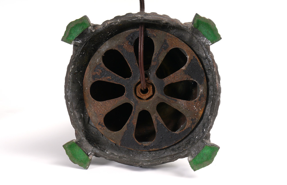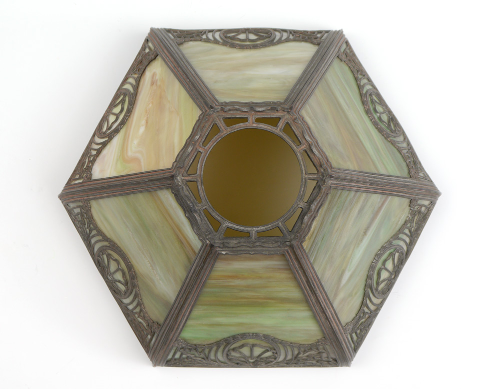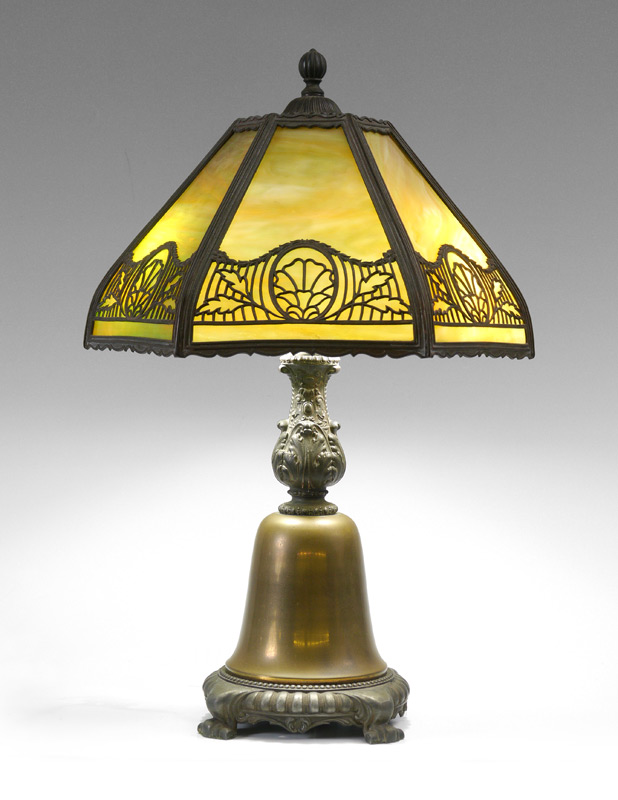 6 BENT PANEL GREEN SLAG GLASS LAMP: Cast metal base on 4 feet with brass bell, double socket fixture. 22 3/4'' h. x 8 1/4''. 6 bent panel shade with filigree frame, green slag glass. 8'' h. x 13 1/4''.