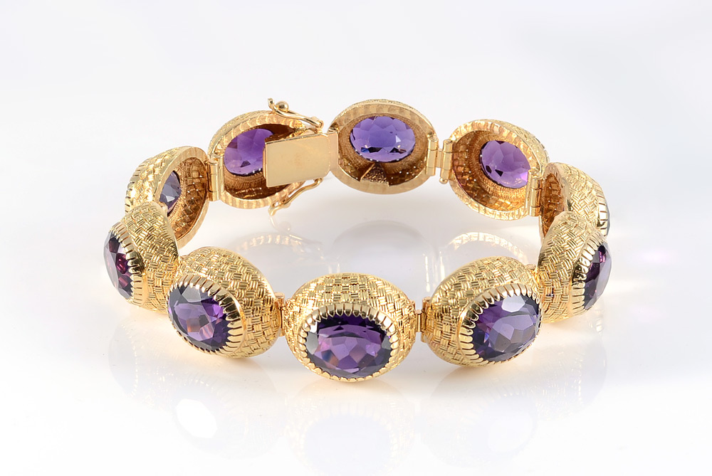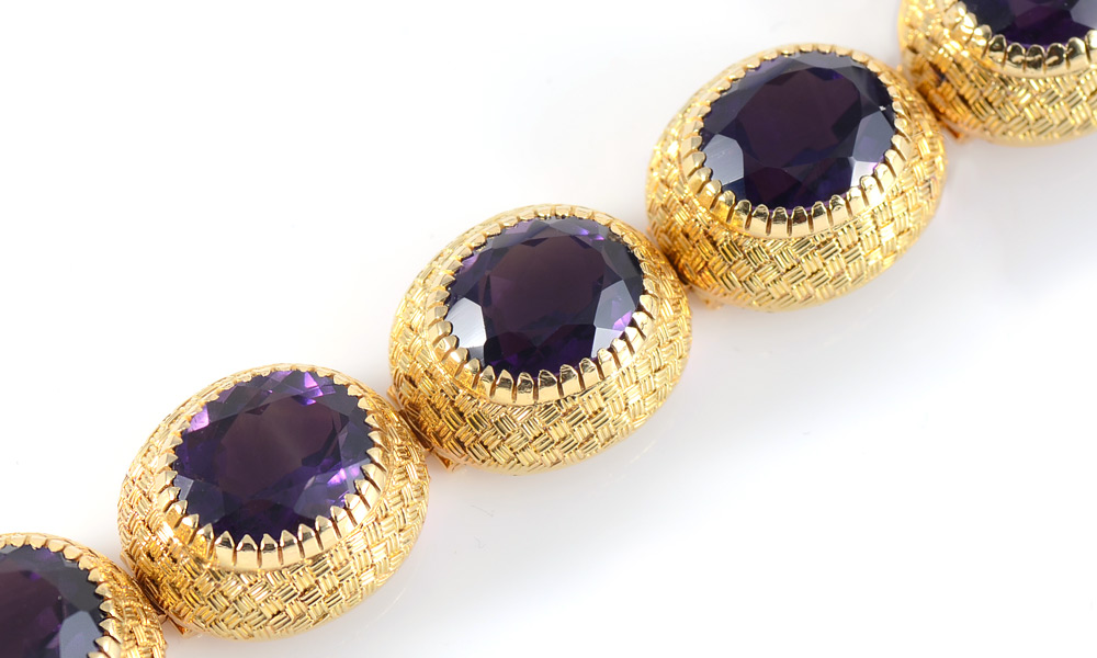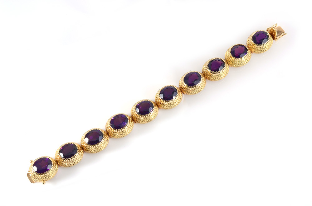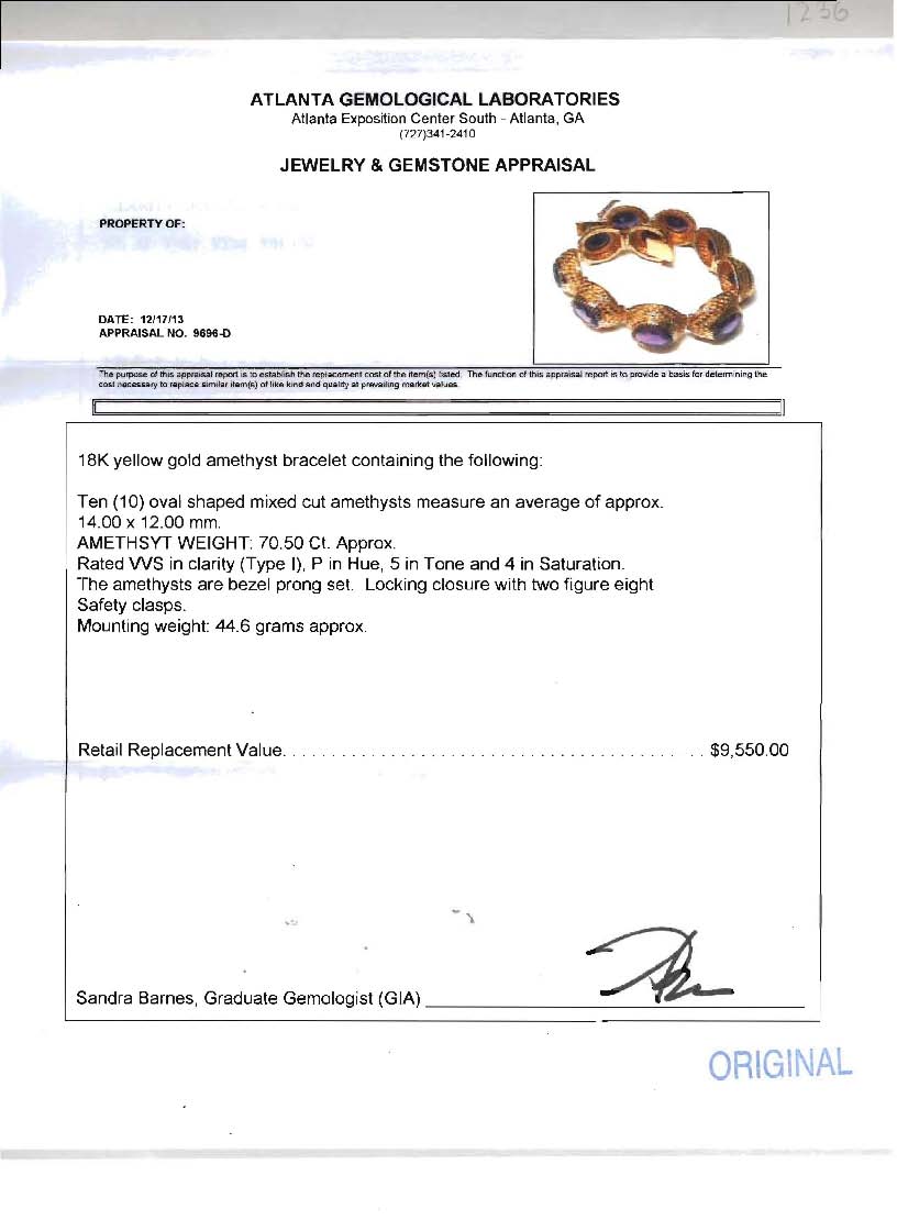 18K GOLD 70.50 CT AMETHYST BRACELET: Retro Deco sculptural bracelet of 10 oval mixed cut amethysts, approx. 70.50 Ct., each measuring approx. 14 x 12 mm. Clarity is VVS, saturation 14. Serrated bezel set. Locking closure with figure 8 safety clasps. David Webb like textured link. Signed ''T''., attributed to Travis of the Copa Cabana. Length 7 1/8''. Weight 44.6 grams. Sold with current Atlanta Gemological GIA graduate's appraisal for $9,550.