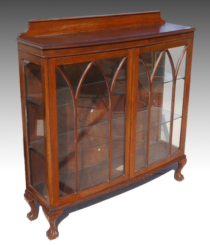 CURIO DISPLAY CABINET: Double door with individual pane glass, slight bow to front of cabinet, interior with two glass shelves, all four cabriole legs ending in ball and claw feet. Overall 49.75''h., cabinet top 46.5''h., 47''w. x approx. 12.5''d.