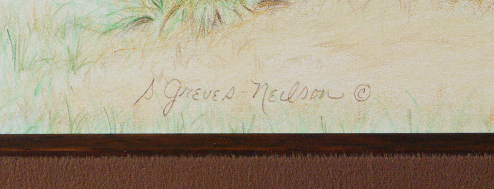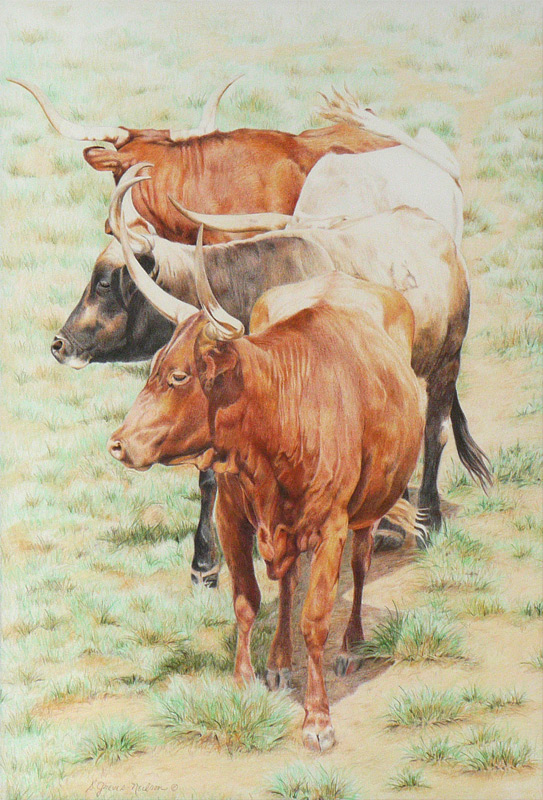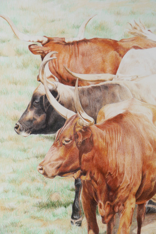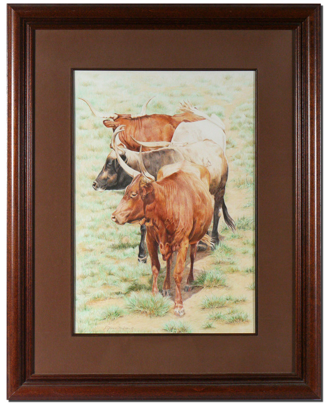 GREVES-NEILSON, Sherie, (American, 20th Century): ''Longhorns, III'', Colored Pencil, Sight size 19 1/2'' x 13 1/2'', pencil signed lower left, labeled verso, encased in a wooden frame 29 1/2'' x 23 1/2''.