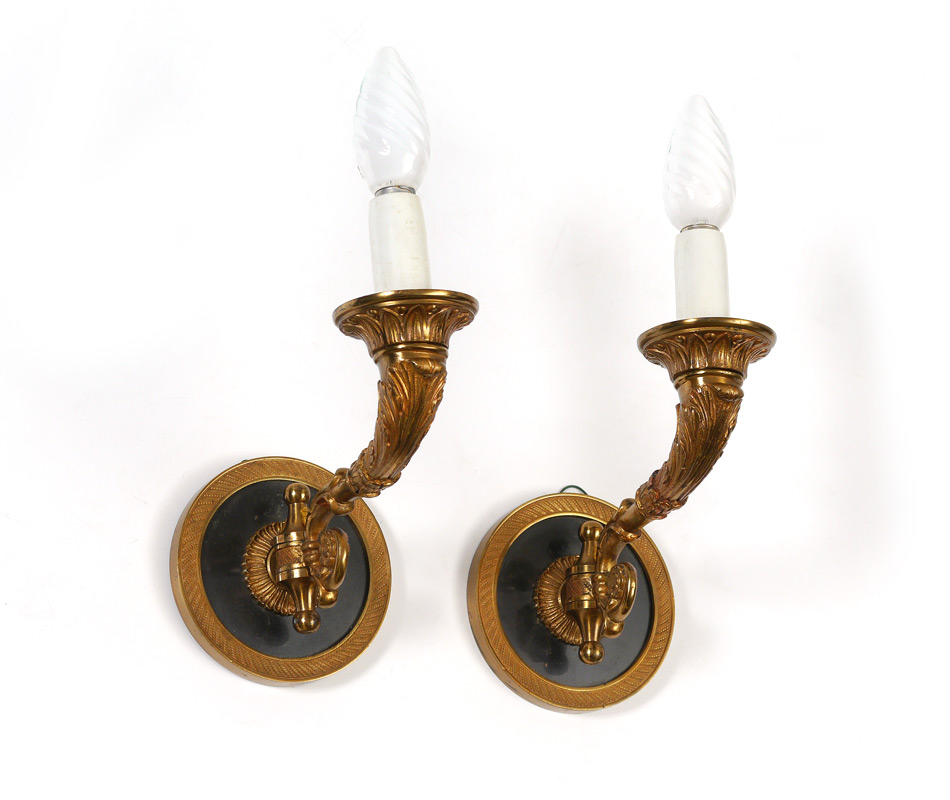 PAIR BRONZE DORE WALL SCONCES: Electric with single light fixture each, articulated arms. Measure 5 3/4'' h. x 4 1/2'' x 7 1/4'' extended.