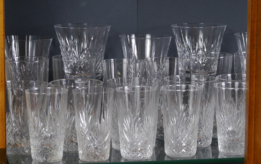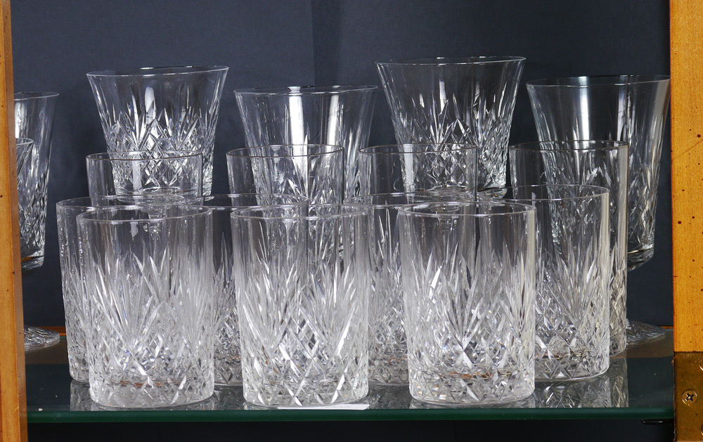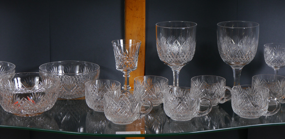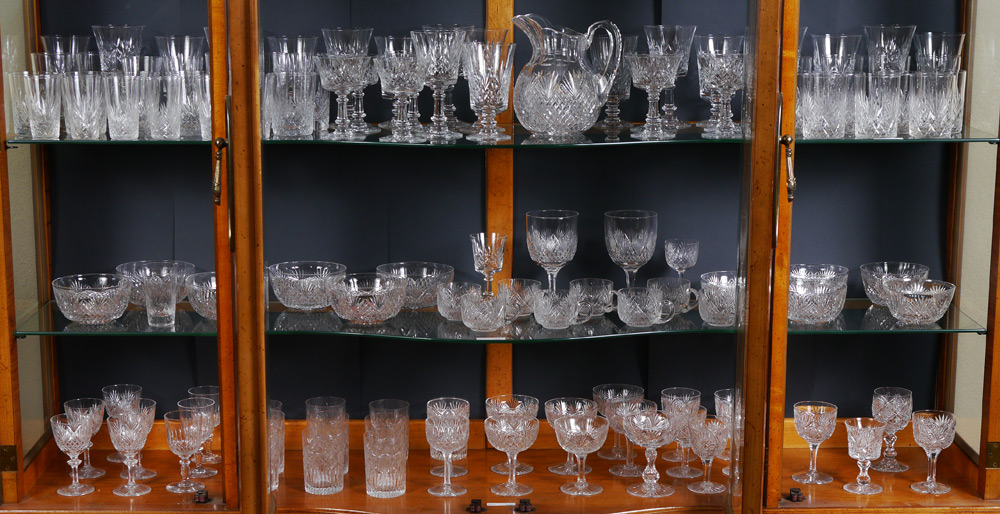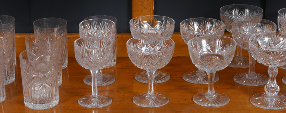 HUGE SUITE OF STRAWBERRY DIAMOND CUT GLASS ATTRIB. HAWKES: Approx 120 pieces to include pitcher, juice and water tumblers, wine and iced tea stems, individual bowls, and punch cups. We discovered the Hawkes mark on one bowl. Included in the count are random pattern tumblers and stemware.
