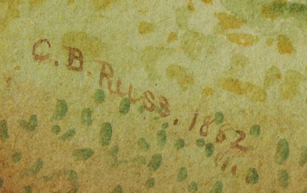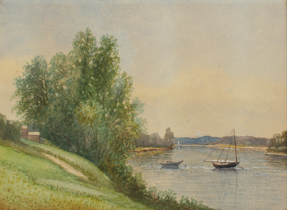RUSS, C. B., (American, 1860-1920): River Scene, Sight size 9 1/2 x 13 1/2'', signed lower left, dated 1882, encased in oak frame 19 1/2'' x 23 1/2''.