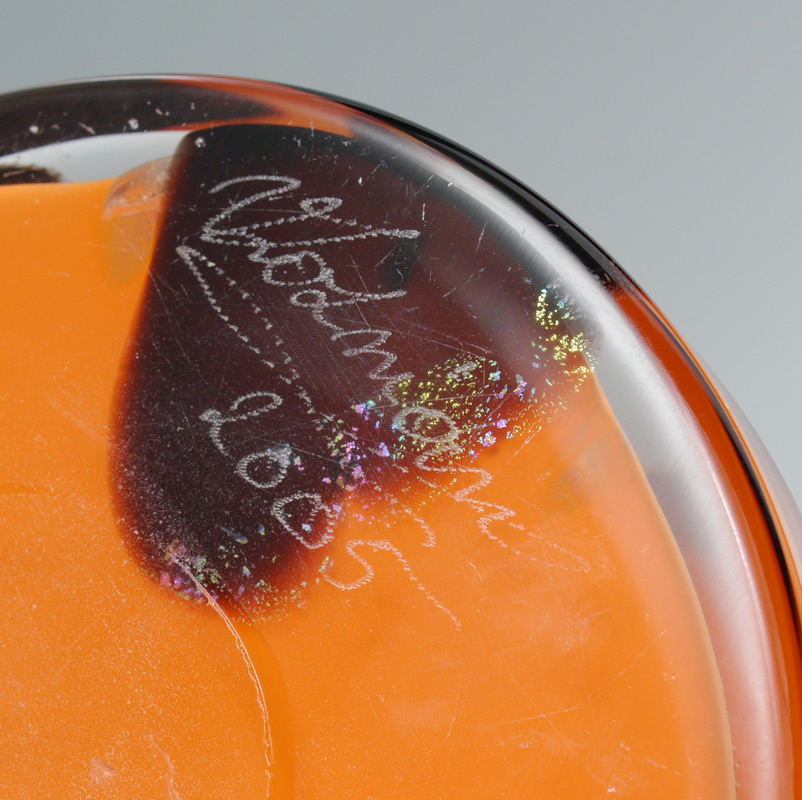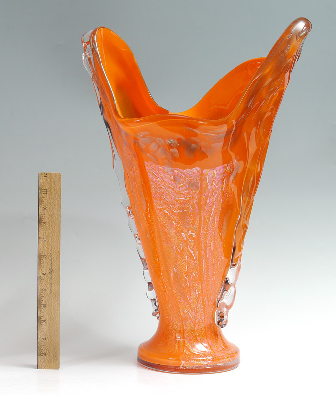 LARGE ORANGE MURANO GLASS VASE: Free form design with orange ground, multi hued and clear glass accents. Illegibly signed on base and dated 2005. Measures 21 1/2'' h. x 15'' x 10 1/4''.
