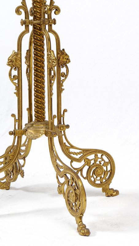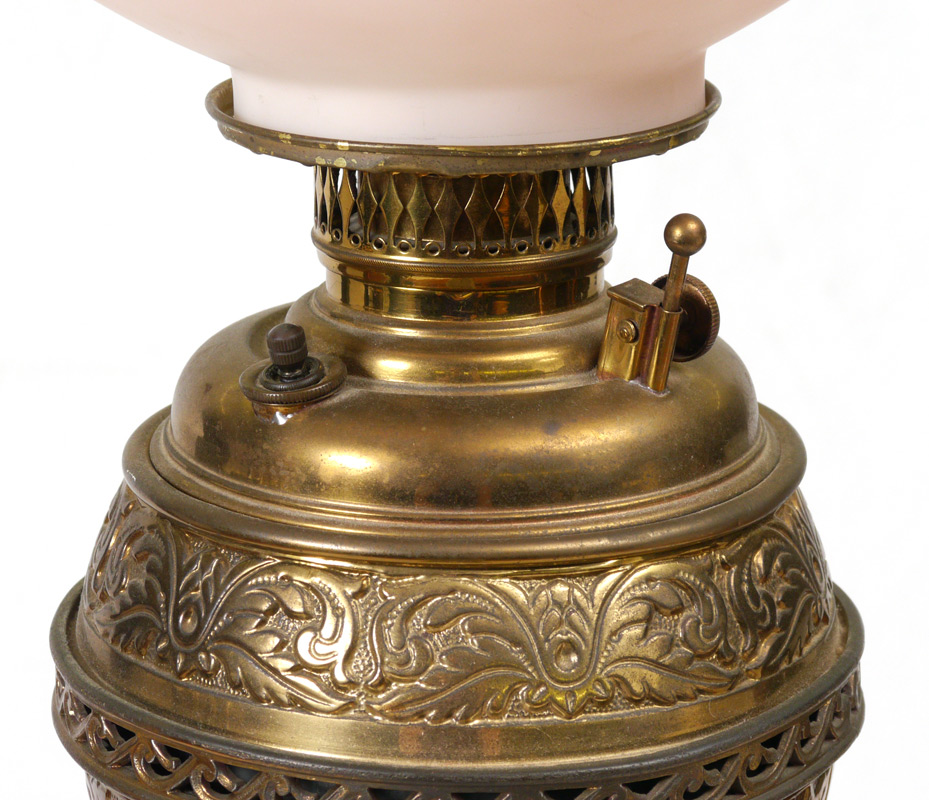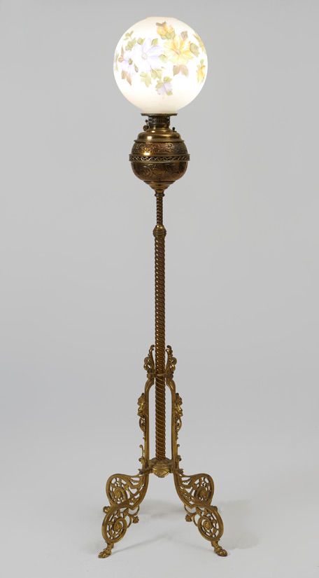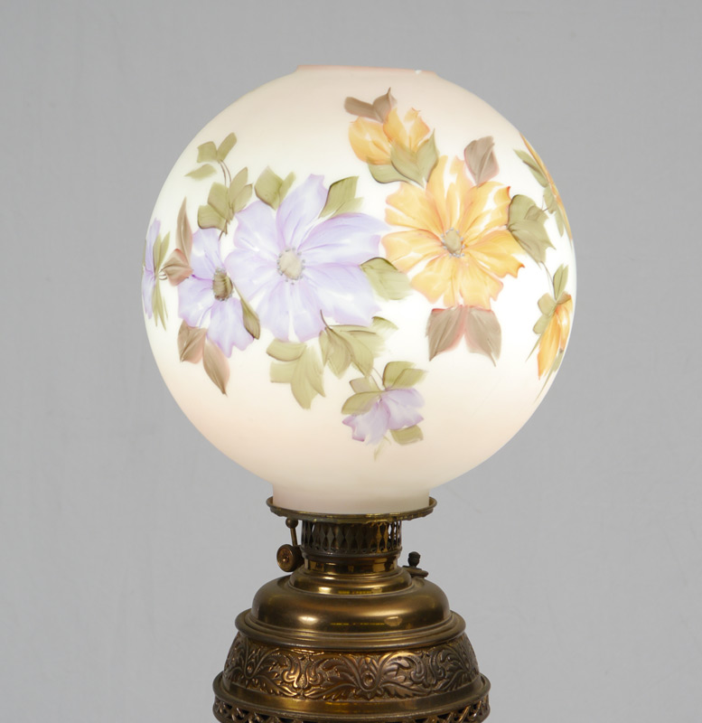 VICTORIAN PIANO FLOOR LAMP: Ornate brass base with hand painted globe shade. Electrified. Measures 52'', the shade adds an additional 11''.