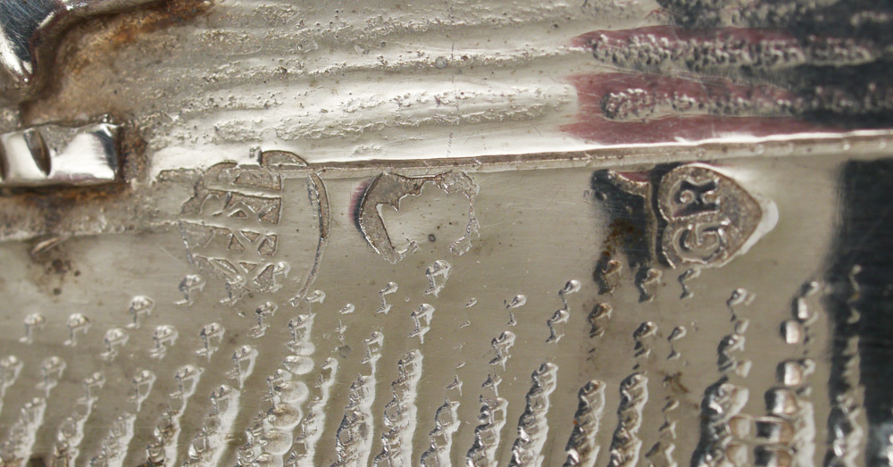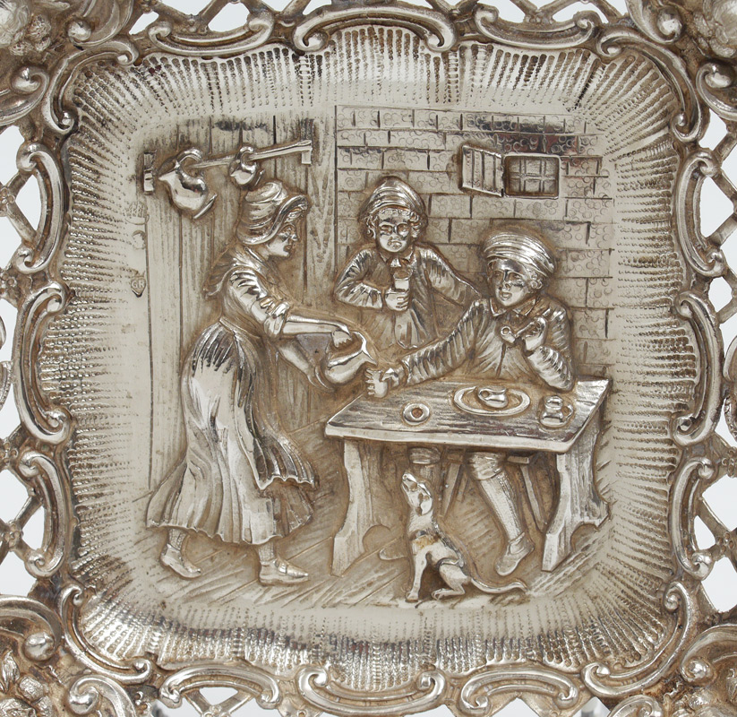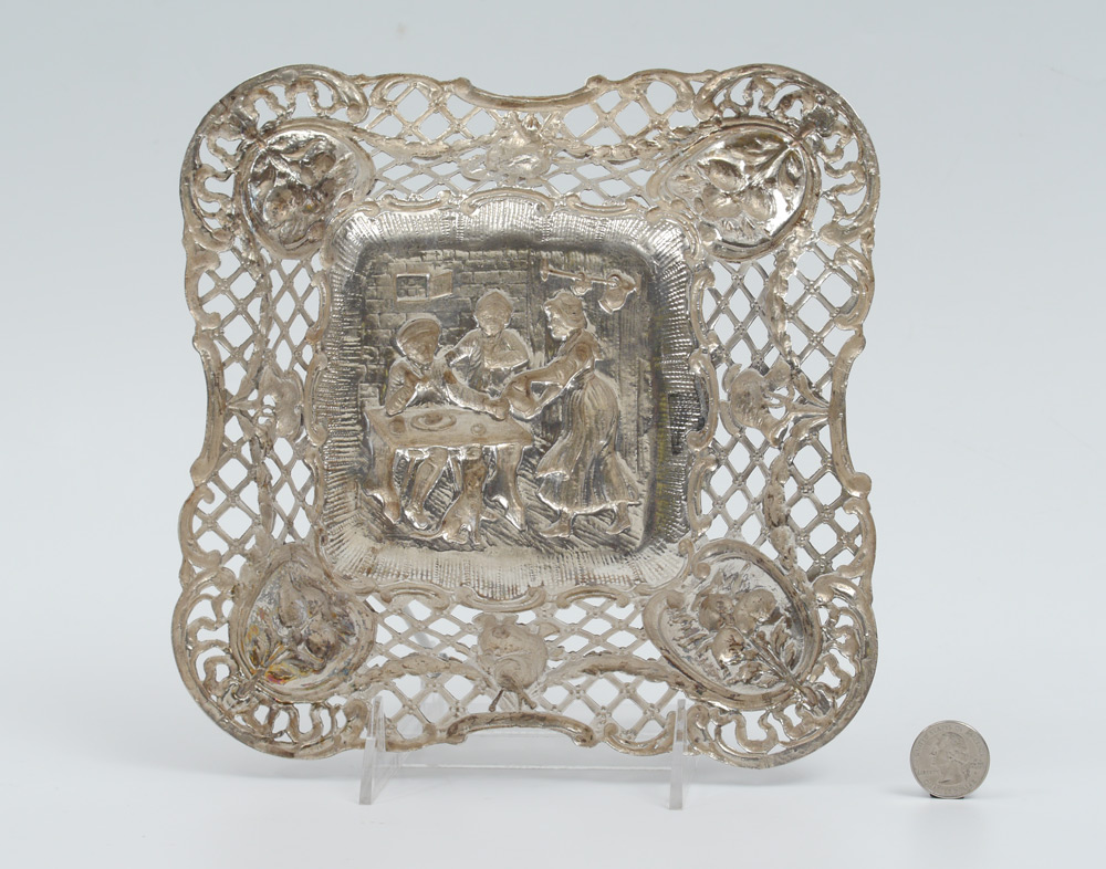 GEORG ROTH & CO. EMBOSSED RETICULATED TRAY: Reticulated sides with embossed medallions of fruit and floral swags. Base with embossed tavern scene, marked with Hanau silversmith Georg Roth & Co. hallmarks. Measures 1 7/8'' h. x 8 3/4'' square. Approx. 10.5 troy oz.