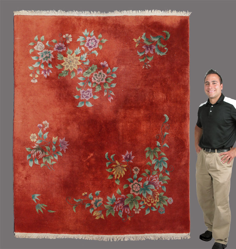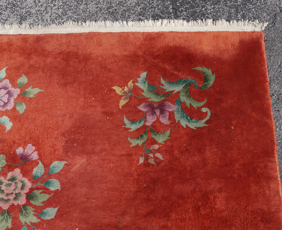APPROX 70-80 YR OLD CHINESE NICHOLS HAND KNOTTED WOOL RUG, 8' x 9'4'': This attractive Deco era Nichols rug has a velvety deep orange field that has asymmetrically placed sprays of flowers that leave much of the field open. The square-ish size is another plus for this rug. If orange is still your new black, this could be the rug for you.