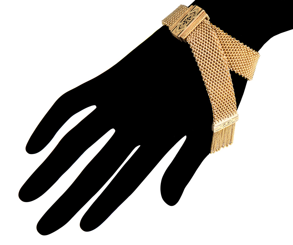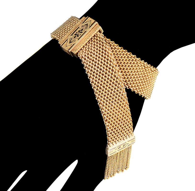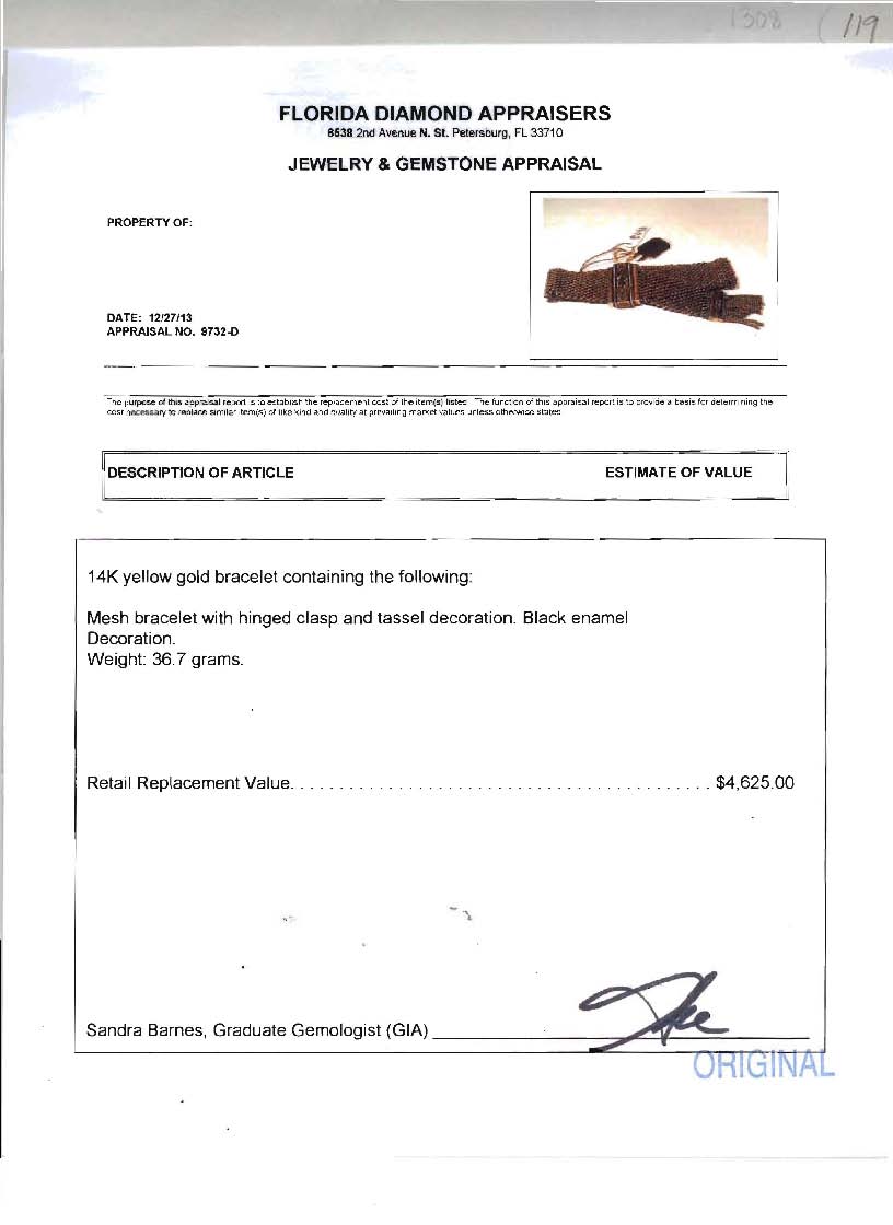 EDWARDIAN GOLD MESH SLIDE BRACELET; 14K yellow gold, black enamel decorated mesh bracelet with tassel decoration. Adjustable size with the functioning slide. Weight 36.7 grams. Sold with current Florida Diamond Appraisers GIA graduates appraisal for $4,625.