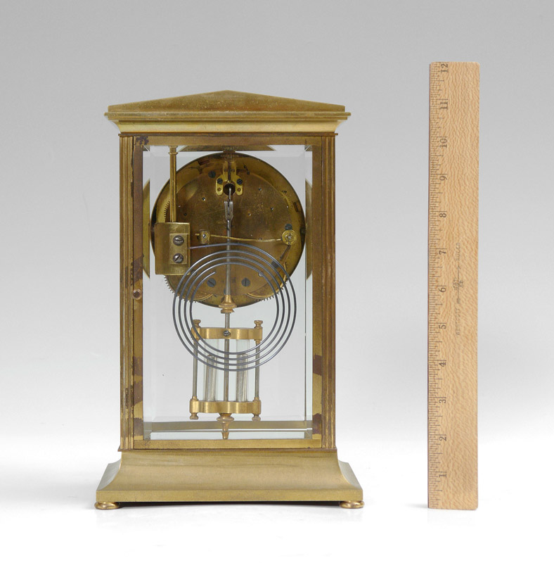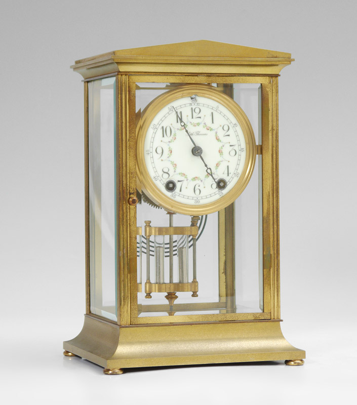 SETH THOMAS CRYSTAL REGULATOR CLOCK: Brass case with architectural top, beveled glass windows. Porcelain dial with floral swags, Arabic numerals, marked Seth Thomas. Key wind time and strike movement with faux mercury pendulum. Overall measures 11 1/4'' h. x 7 1/4'' x 5 3/4''.