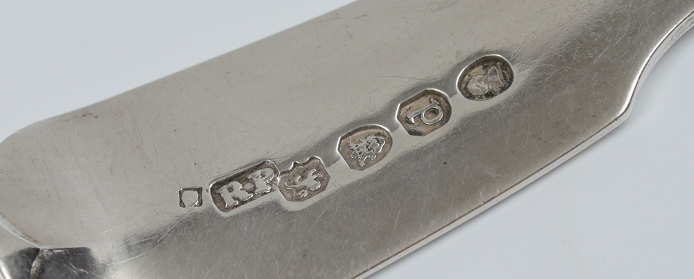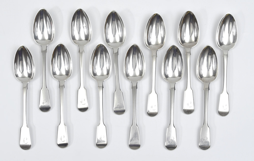 12 RICHARD POULDEN ENGLISH STERLING SILVER SPOONS: 12 Georgian table spoons bearing the hallmark of Richard Poulden, 1819, London. Monogrammed F, 7'' long. Approx. 16.6 troy oz.