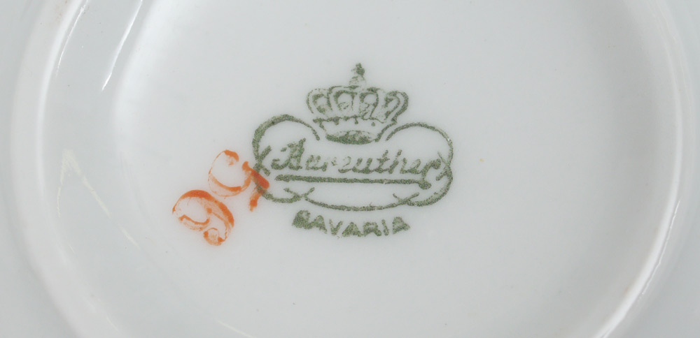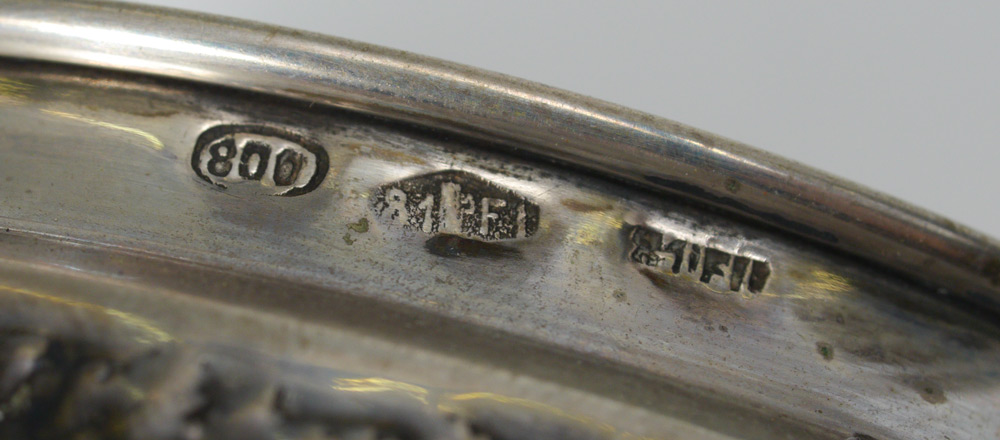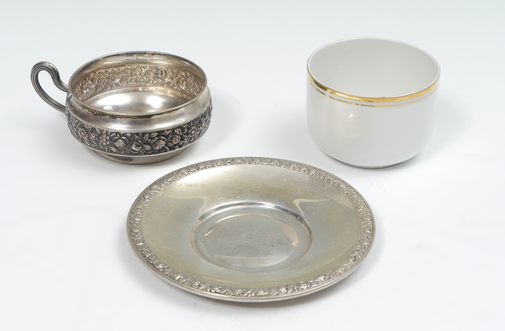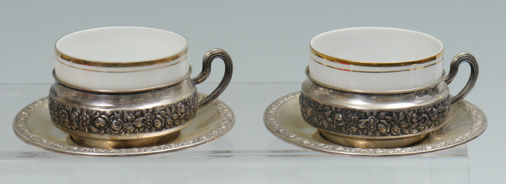 SET OF 12 ITALIAN SILVER AND PORCELAIN DEMITASSE: 12 Bareuther porcelain demitasse cups mounted in floral embossed Italian 800 silver with handles with 12 matching silver saucers. Cups 1 5/8'' h. x 3 1/4'', saucers 4'' dia.