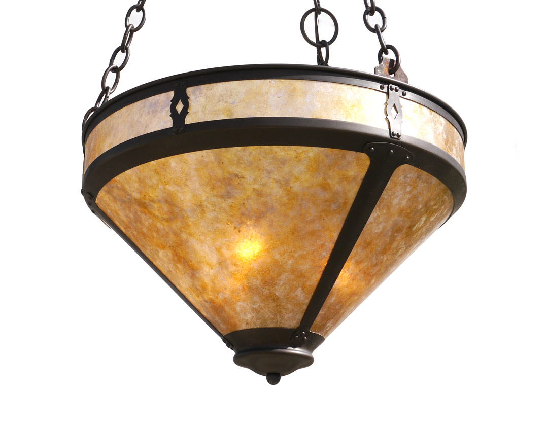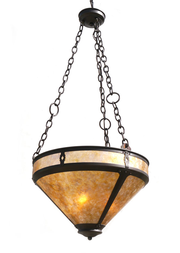 MICA SHADE ARTS & CRAFTS STYLE CHANDELIER: Contemporary Arts and Crafts style with metal frame and mica inserts. 3 light fixture. 14 1/2'' h. x 20 1/2''.