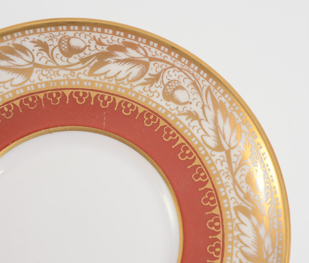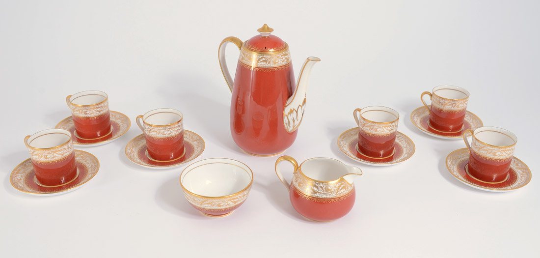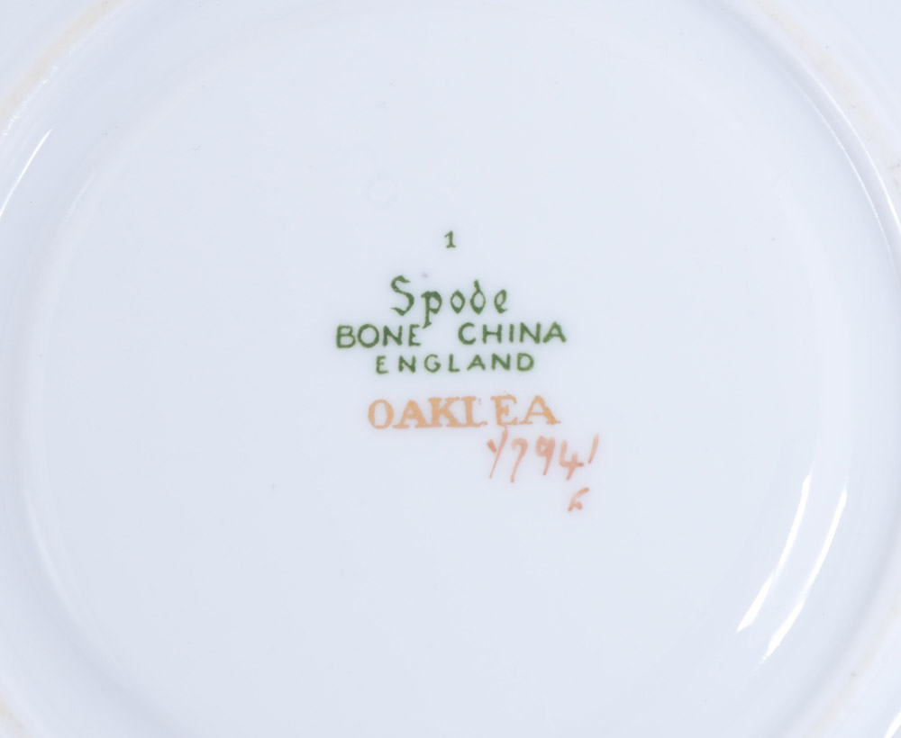 SPODE CHINA ''OAKLEA'' COFFEE SET: To include the pot (7 1/4''), 6 demi cups, 6 saucers, cream pitcher and sugar.