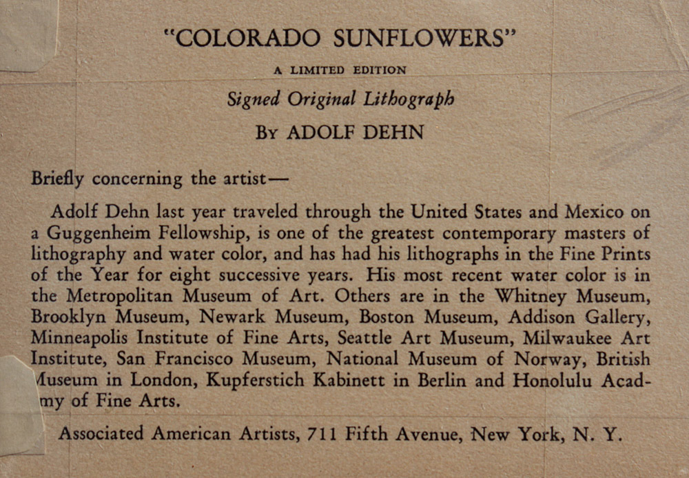 DEHN, Adolf Arthur, (American, 1895-1968): ''Colorado Sunflowers'', Lithograph, 12 1/2'' x 17 1/2'', pencil signed lower right, original AAA label affixed verso, unframed.