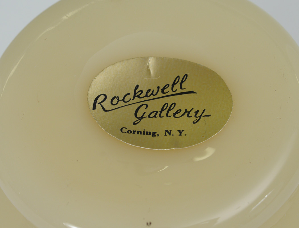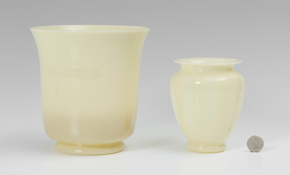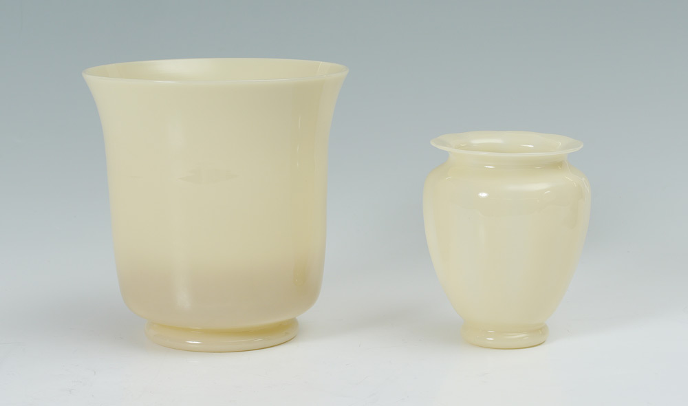 2 STEUBEN IVORY ART GLASS VASES: To include 1) Unsigned, flared rim, measures 6 3/4'' h. x 6 3/4''. 2) Unsigned smaller ribbed vase, Rockwell Gallery foil label on base. 5 1/8'' h. x 4''.