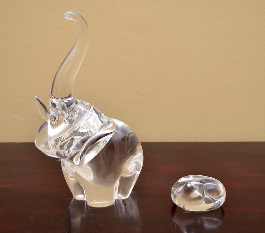 STEUBEN CRYSTAL ELEPHANT & A FIGURAL HAND COOLER: 2 pieces total, both with engraved Steuben, to include 1) Elephant paperweight, 8 1/2'' h. x 5''. 2) Sleeping cat hand cooler, 2 1/2'' long.