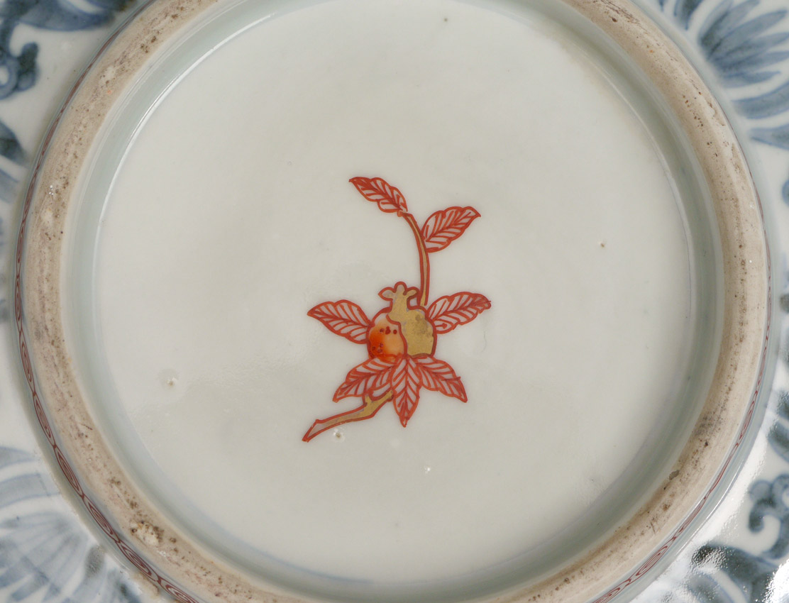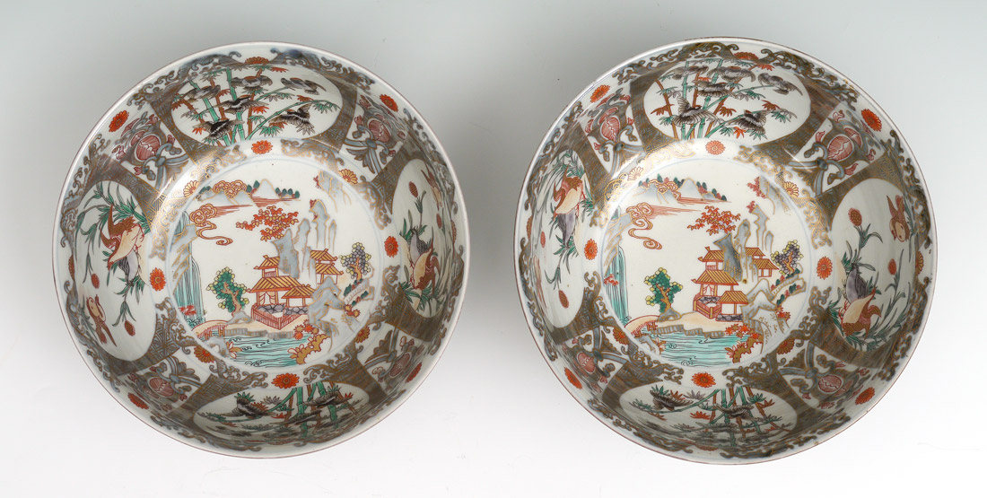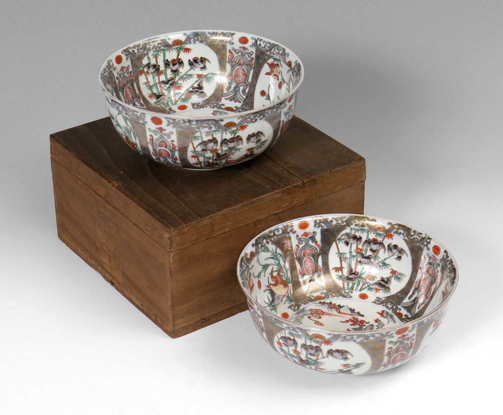 2 JAPANESE IMARI BOWLS IN ORIGINAL BOX: Central medallion with outdoor genre scene inside base of bowls, reserves featuring birds, bamboo and floral motifs. Base marked with berry on a branch, 4 1/4'' h. x 9 3/4'' dia.. Sold with original box with Japanese writing on outside. Box measures 6 1/4'' h. x 11 1/2'' x 11 1/2''.