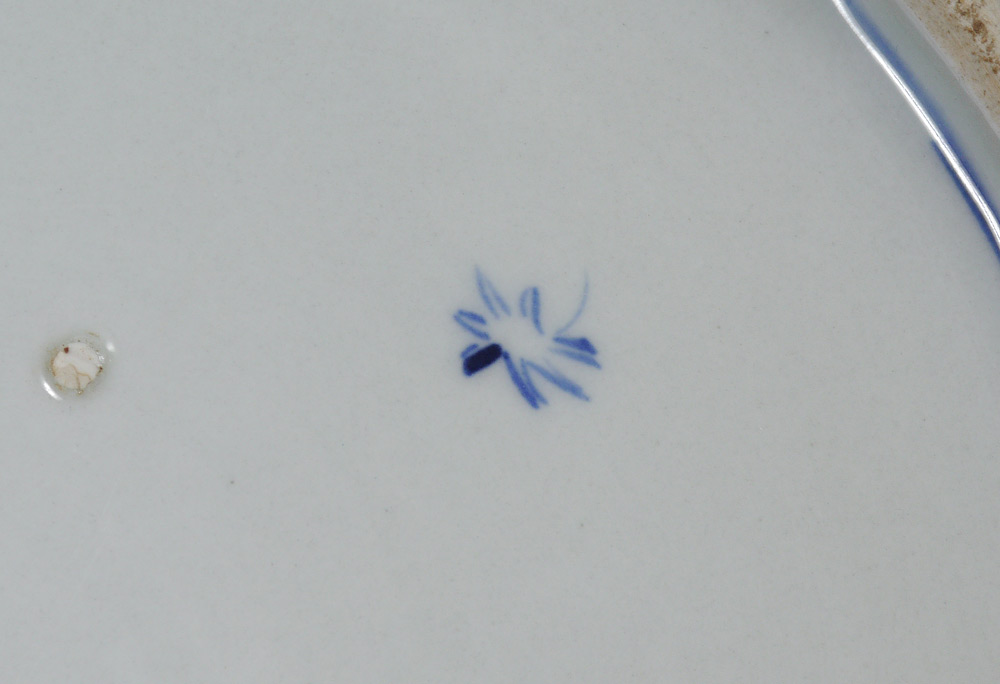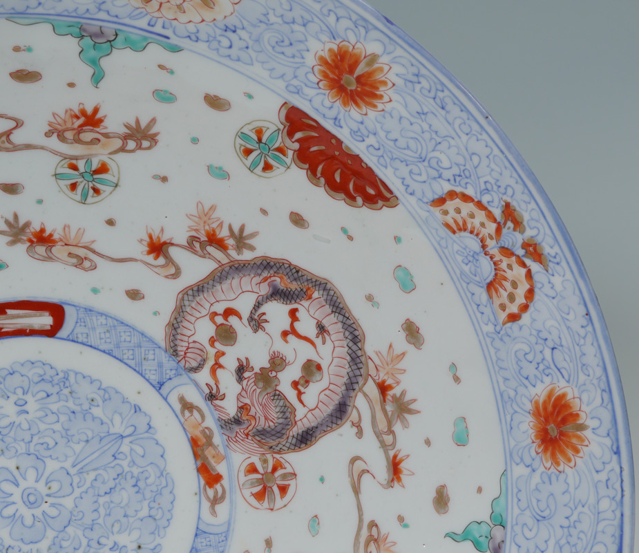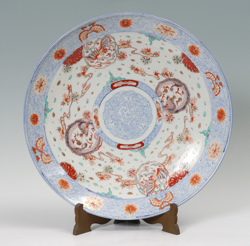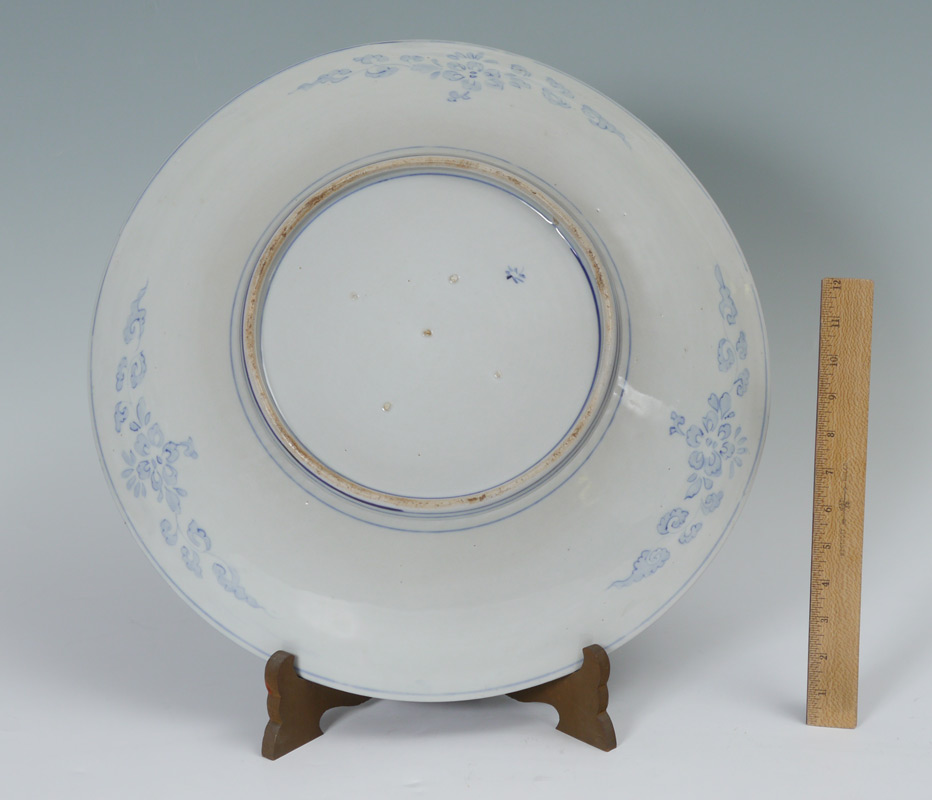 LARGE ORIENTAL POLYCHROME CHARGER: Blue decorated rim with floral accents, central blue medallion, sides with figural dragons, roosters, clouds, and medallions. Unknown flower mark on base. Overall measures 18 1/2'' dia. Sold with wood folding plate stand.