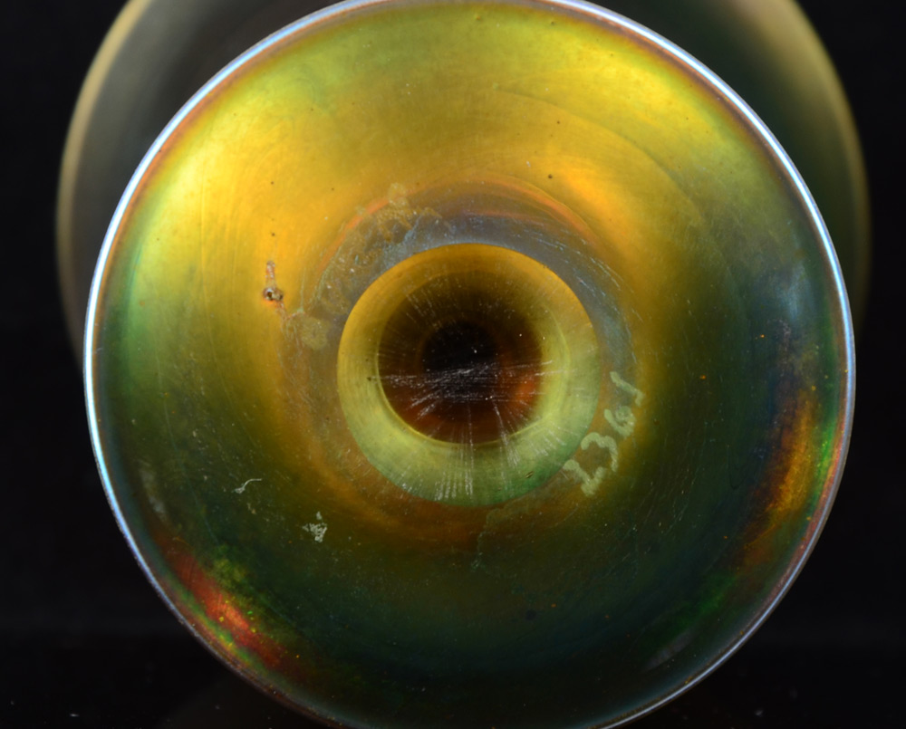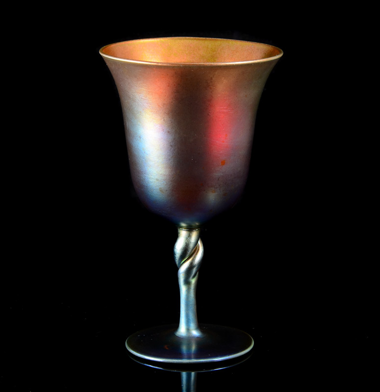 STEUBEN AURENE ART GLASS CHAMPAGNE STEM: Single champagne with twist stem, marked Aurene 2361. 6 1/8'' h..
